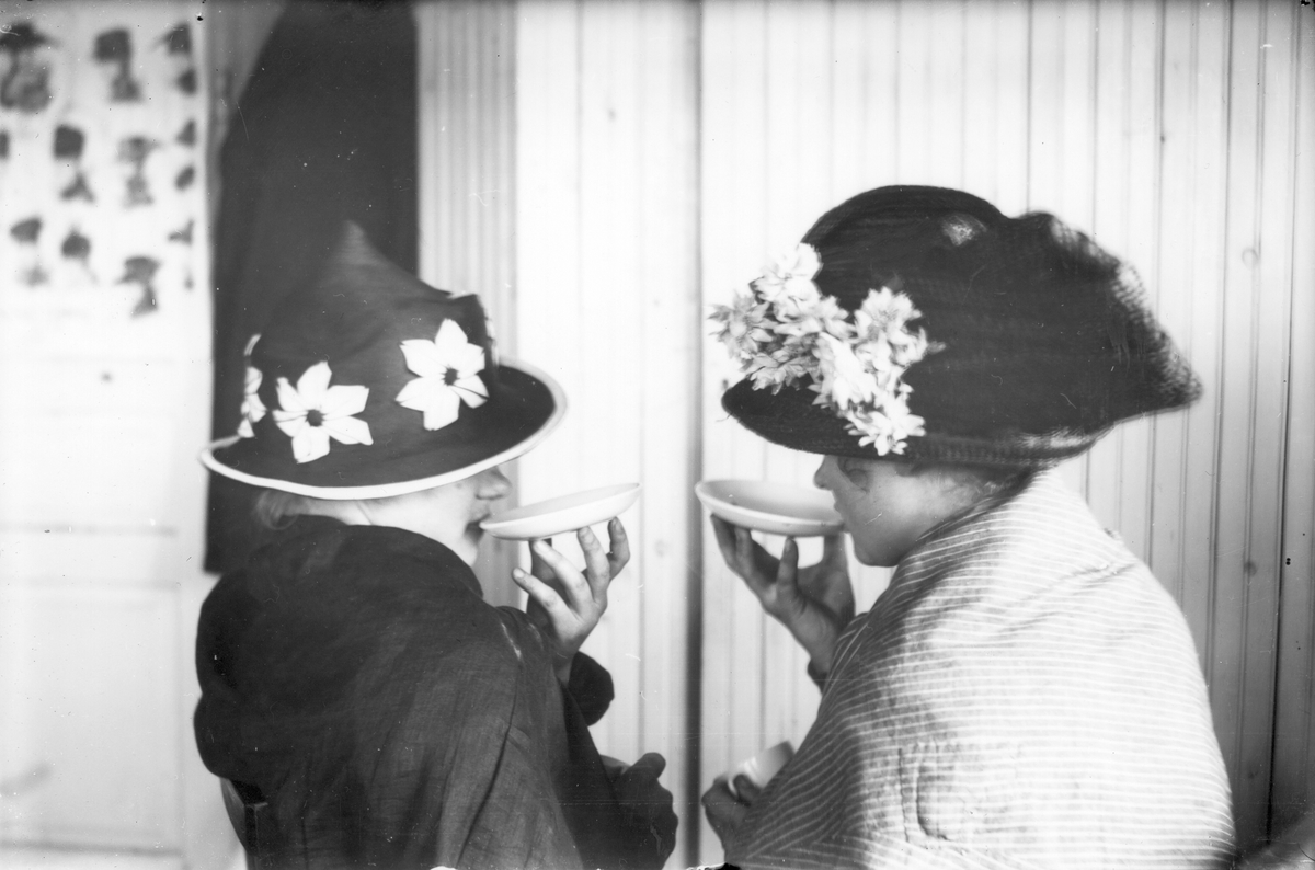 Två okända kvinnor "sörplar" kaffe från kaffefat. Foto i maj 1919.
