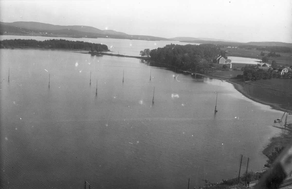 Vy från kyrktornet över Vågen i Bollnäs. Till höger Folkhögskolan och "Jon-Erssons".