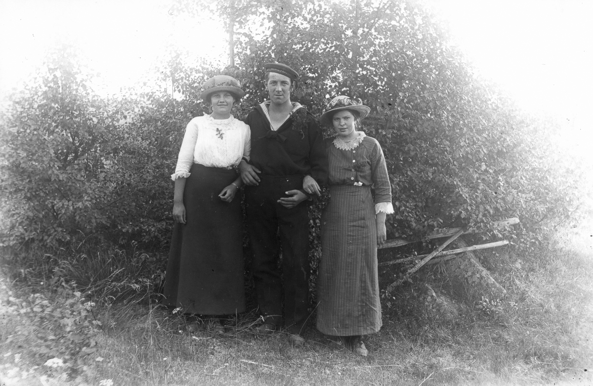 Till vänster Edla Olsson (släkt till Skinnars), till höger Lisa Eriksson, född 1901, dotter till trädgårdsmästaren. Mannen är okänd.