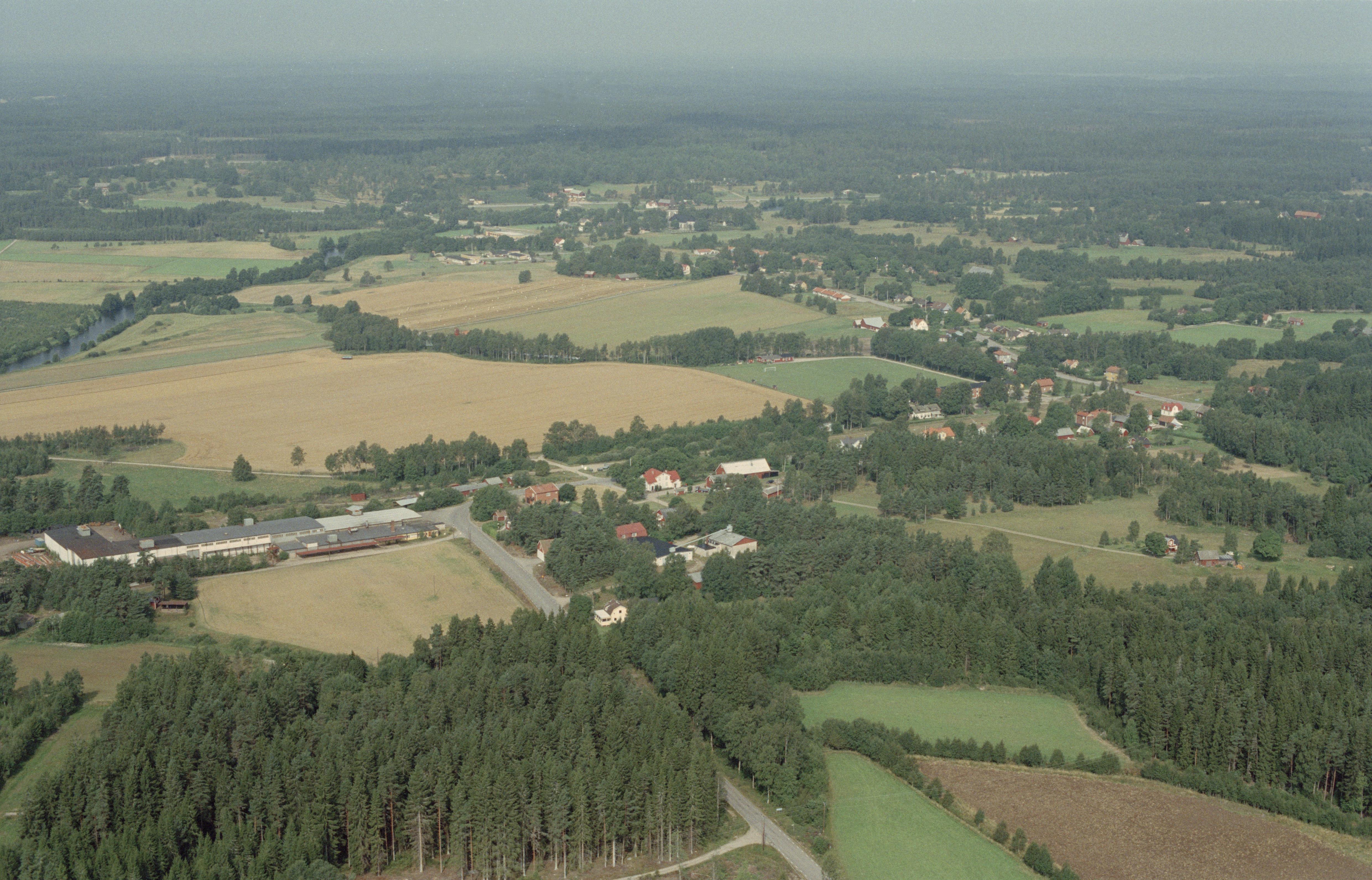 Hamneda kyrka och kyrkby. Kyrkan skymtas till höger om bildens mitt. Bilden är tagen mot (väderstreck): NV