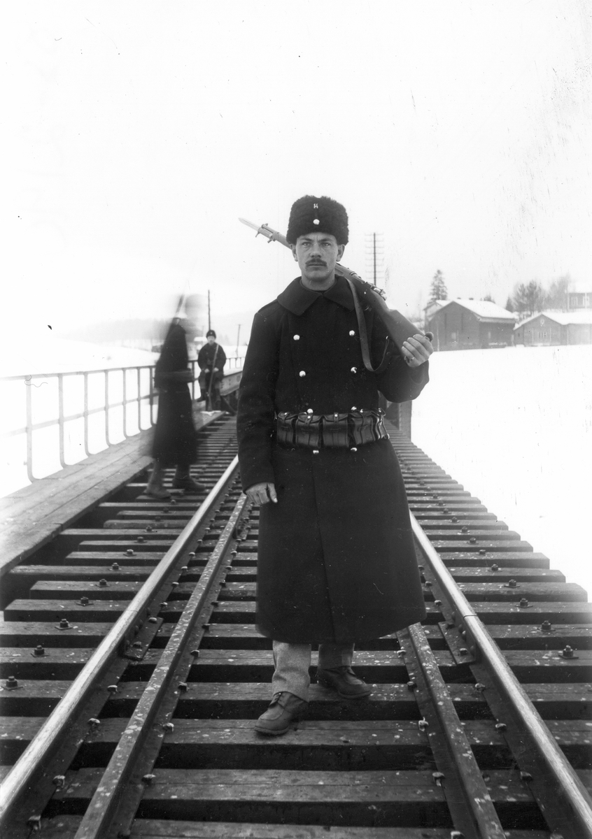 Okända soldater vaktar bron över Voxnan under första världskriget.