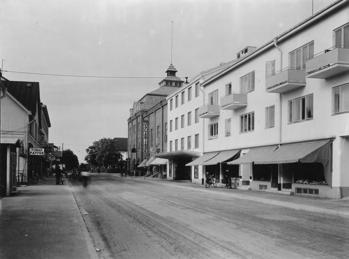 Hyttgatan i Sandviken. Längst upp till höger på bilden, Folkets Hus med Oskaria skoaffär och Sagabiografen hitom.