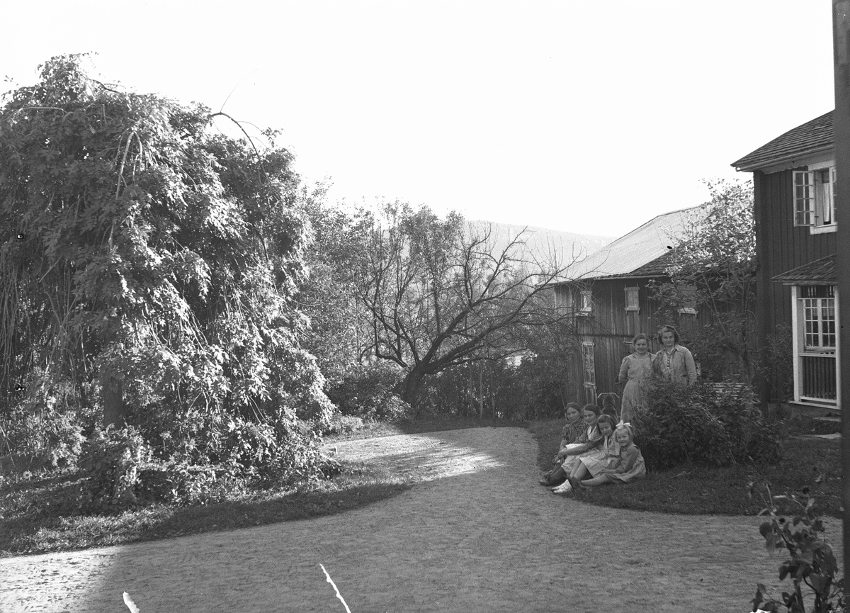 Elin, Helfrid, Agnes, Marta, Ann-Mari och Anita med hunden Perry på Västergården Vallsänge