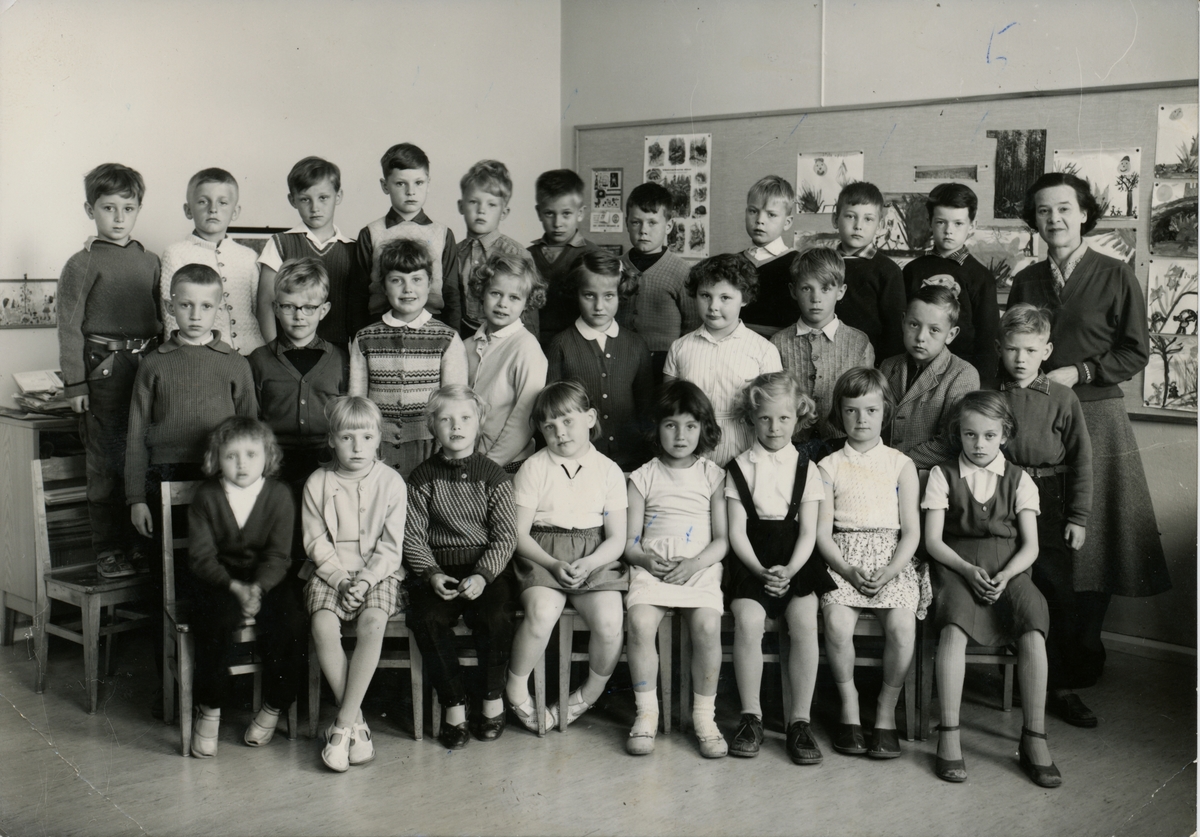 Eventuellt klass 1 på Norrtullsskolan. Christer Westberg-Drost står i mittenraden, andra från vänster (med glasögon). Lärarinnnan heter Ada Hall.