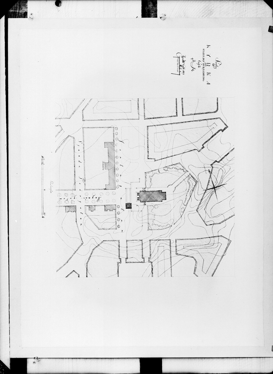 Ritning där kyrkan är belägen på krönet av Brynäsgatan