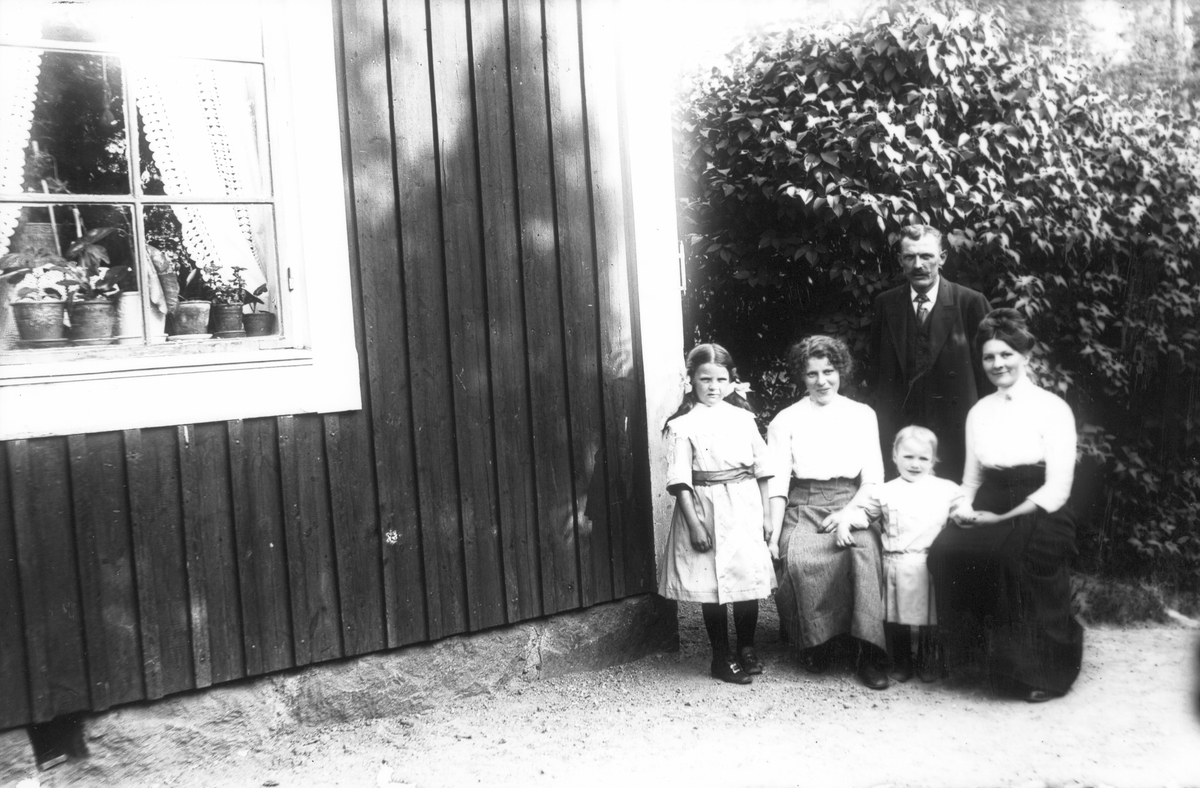 Personerna är från vänster: Signe Winkvist (dotter till Ida Winkvist), Selma Lundquist (född Gustafsson 1890, dotter till banvakt Gustafsson), Maj Winkvist, John Winkvist och Ida Winkvist, född Gustafsson 1882.