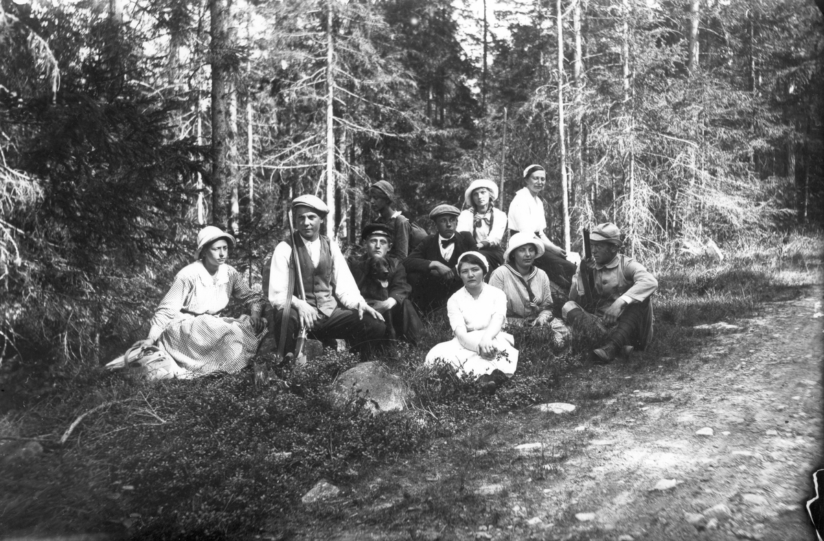 Från vänster: Karin Eriksson, Johan Eriksson, Verner Hall, okänd, Sixten Swanström, Vendla Johansson, okänd. Astrid Swanström sitter i mitten framför.