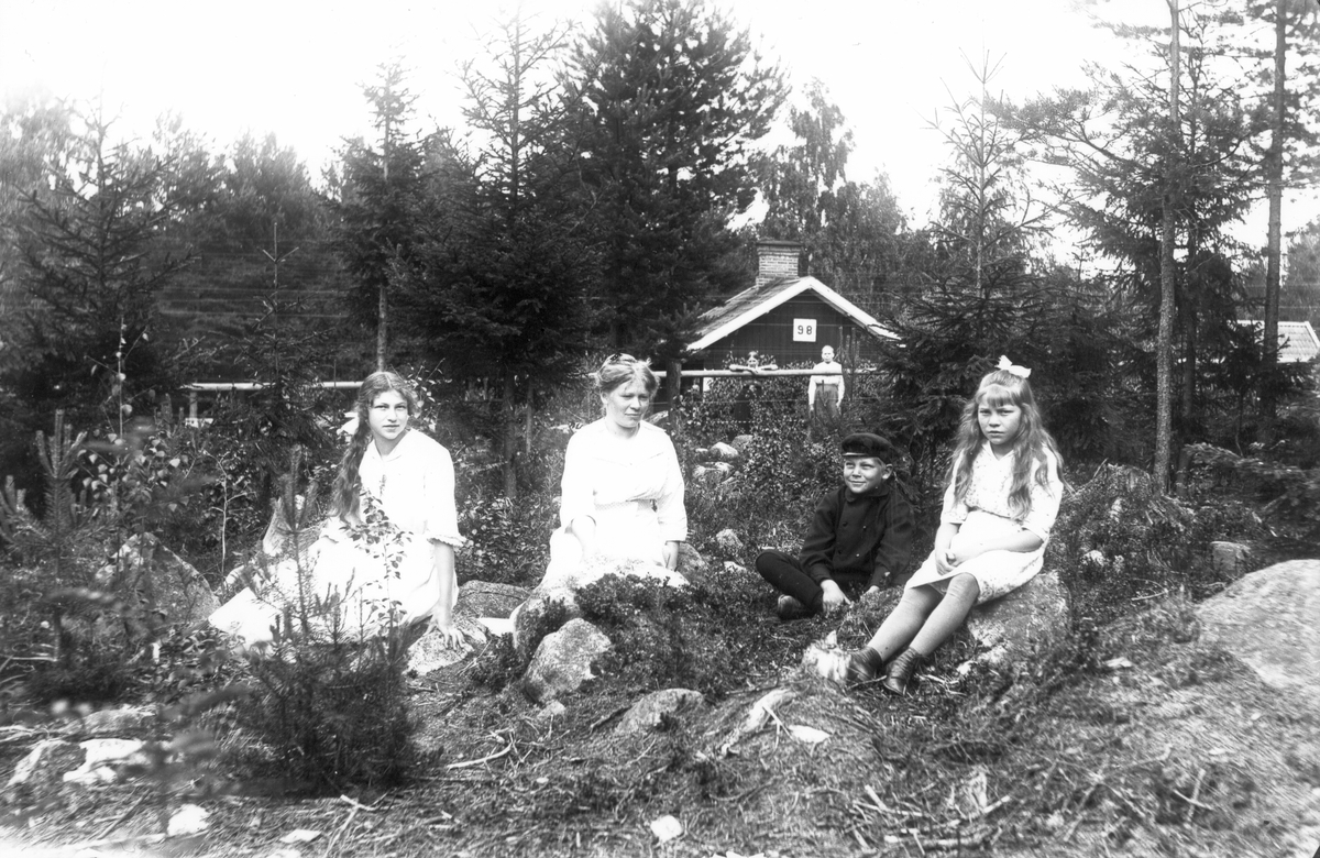 Banvakten Gustafssons barn och barnbarn vid banvaktsstugan söder om Lenninge-Voxsätter. Från vänster: Ida Hedberg (dotter till Elly), Elly Hedberg (född Gustafsson 1879), Ambro Hedberg och Tekla Hedberg. I bakgrunden Ida Gustafsson.