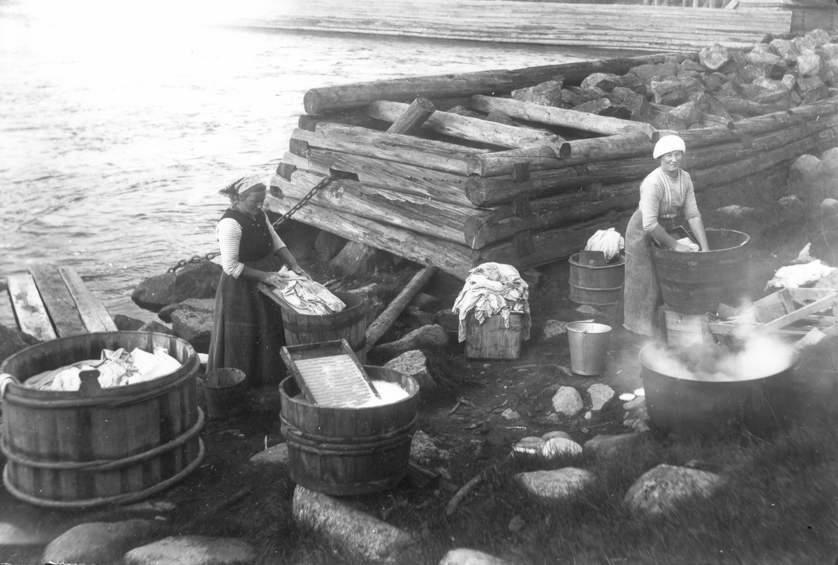 Till vänster "Jumblas"-Kristin Edlund från Voxsätter 13:5, född 1873, och till höger Målar-Elin (Nilsson), född 1893, som tvättar vid Voxnan. Bilden troligen tagen 1915.