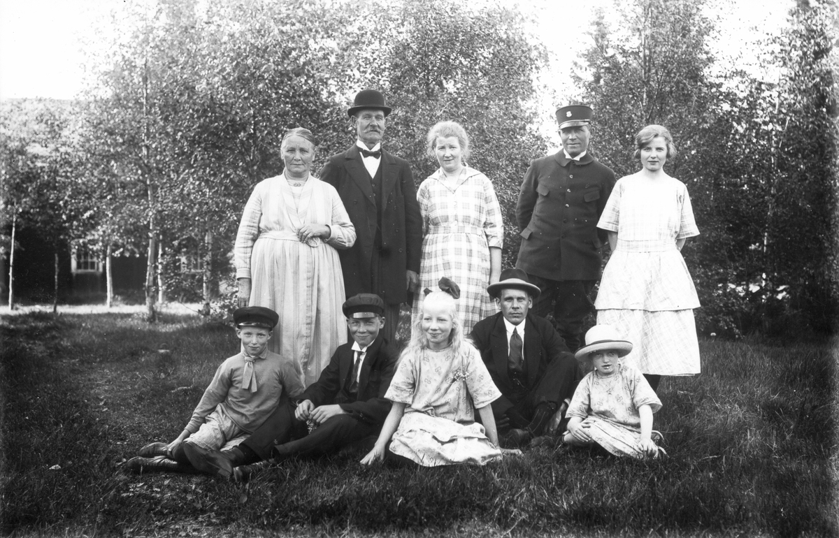 Kusken Jansson på herrgården med familj. Stående från vänster: två okända personer, fru Jansson, Tyko Jansson och dottern Britta. Sittande från vänster barnen Bengt, Martin och Dagmar, övriga två okända.
