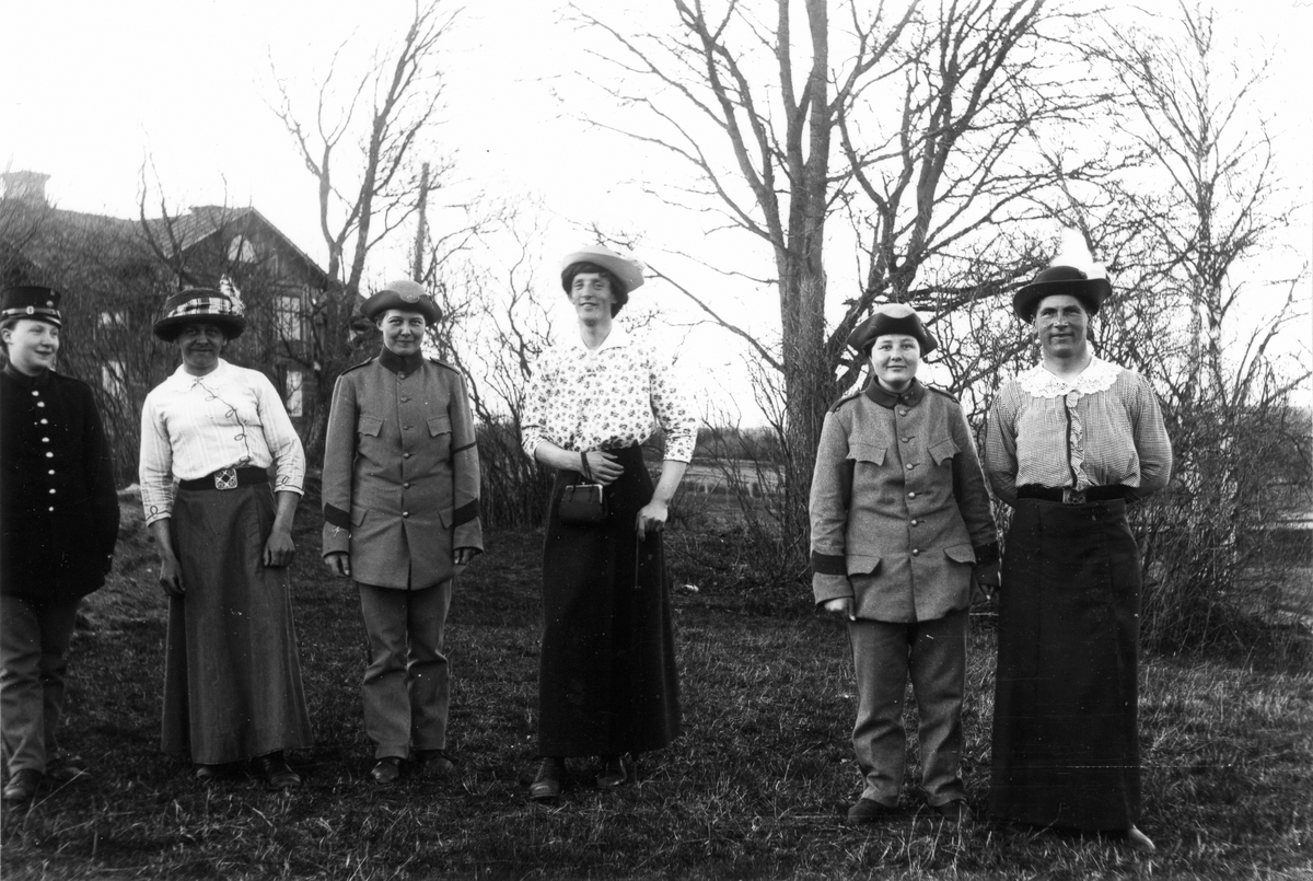 Utanför Skinnars i ombytta kläder. Från vänster: Sara Ek, okänd, Skinnar-Brita (Persson), Lundeberg (son till brukspatron på Mackmyra bruk) samt två okända personer.