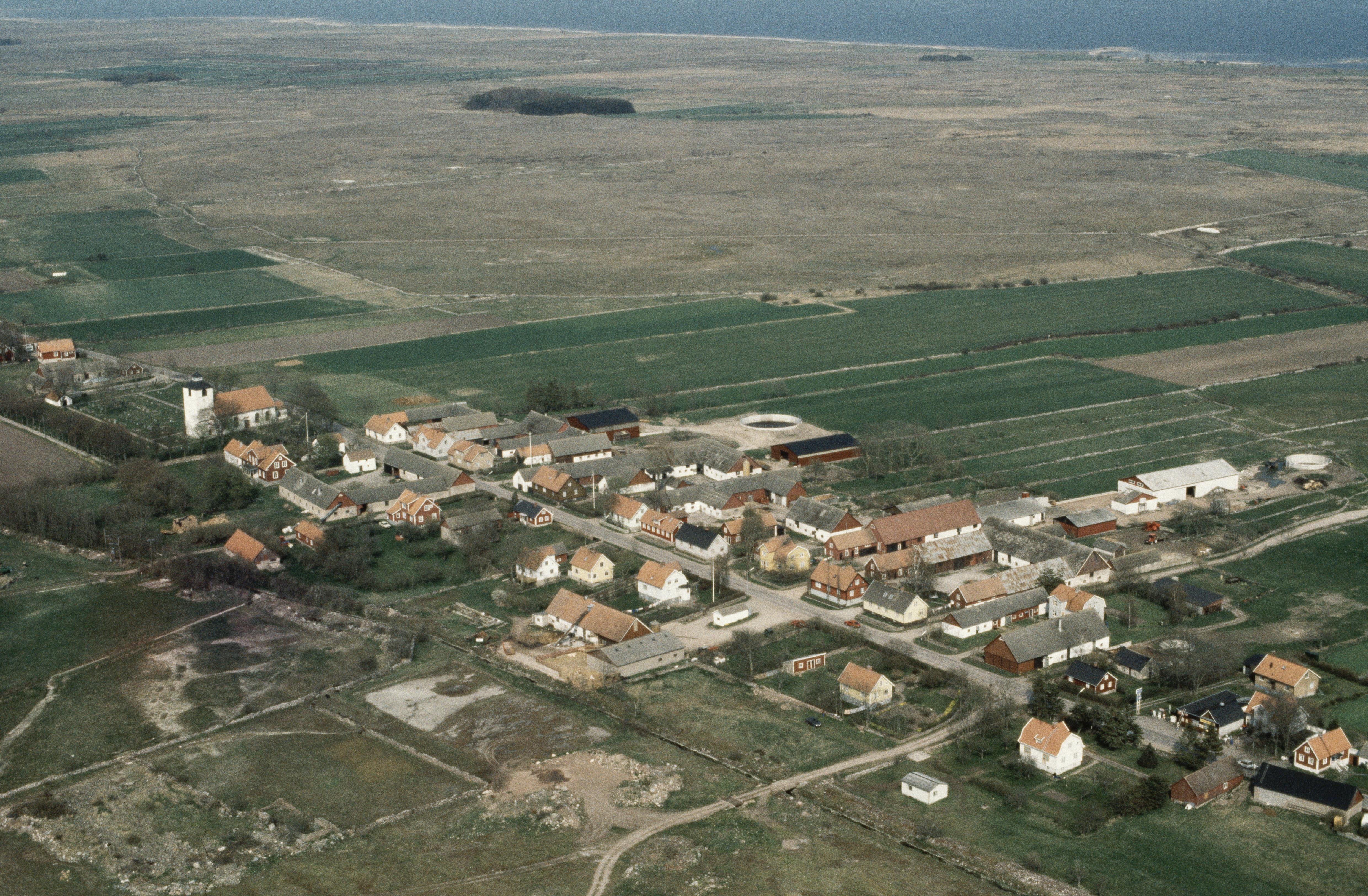 Alvaret. Hulterstads kyrka och kyrkby. Bilden är tagen mot (väderstreck): NO
