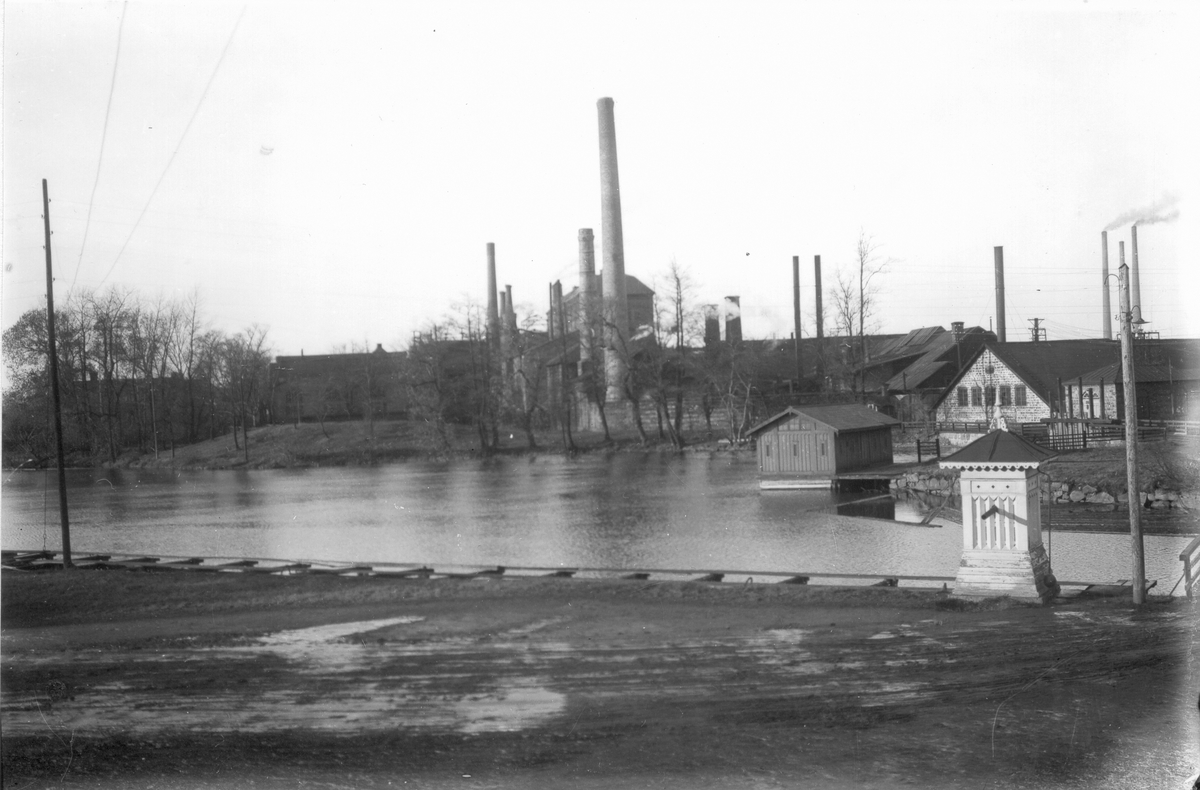 Från vänster bakom träden hyttvillan, även kallad Andersvillan, och "Täcka udden", gaskraftcentralen, hyttan, götverket, gjuteri, glödgugnshus, i förgrunden pumphus. Fotograferat före 1919 eftersom laboratoriet ej är med. Vyn sedd från kontoret.