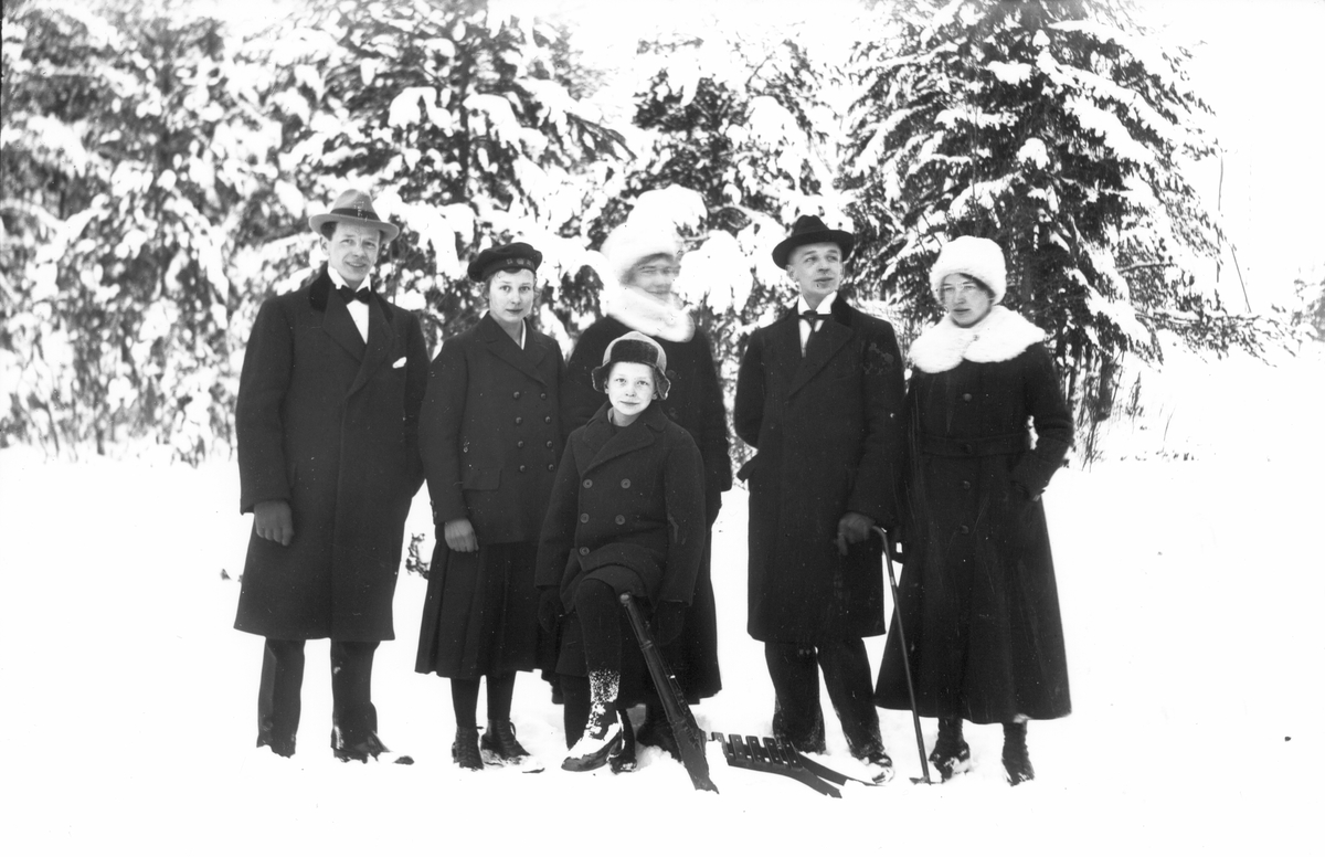 Syskonen Söderberg. Från vänster: Martin, Olga, Hagar Jakobsson, Algot, Verner samt Frida. Sparken är tillverkad av bysmeden Nils Nyberg, Voxsätter 2:7. Se även bild nr C 90-3901.
