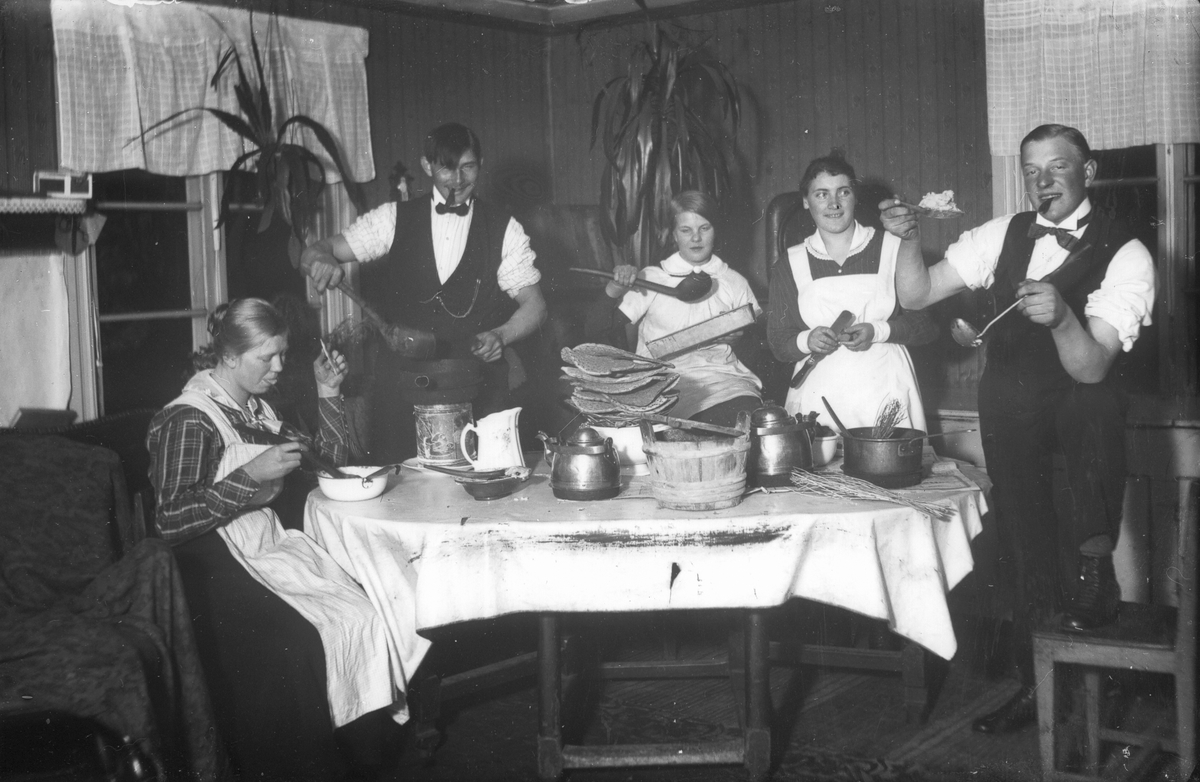 Inne i "brystugga" på Näset, Voxsätter nr 1. Från vänster: Ingeborg Svensson, hennes fästman Helmer Halvarsson från Freluga, Märta på Näset (Märta Nilsson), Gerda Klahr samt Petrus Nilsson.
