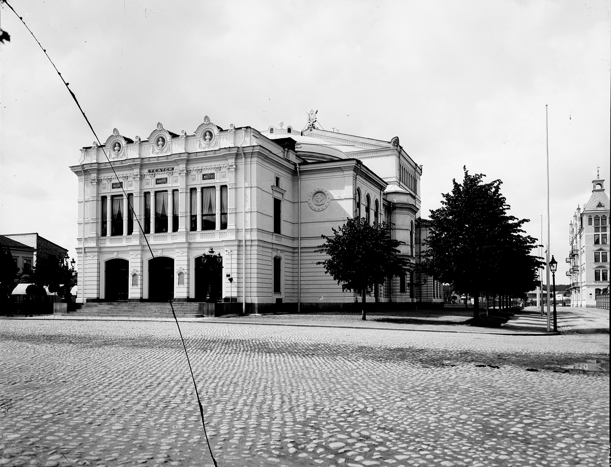 Entrén har sin förebild i Parisoperan med flera portar som ovanför har runda nischer med byster av Mozart, Shakespear coh Moliére.