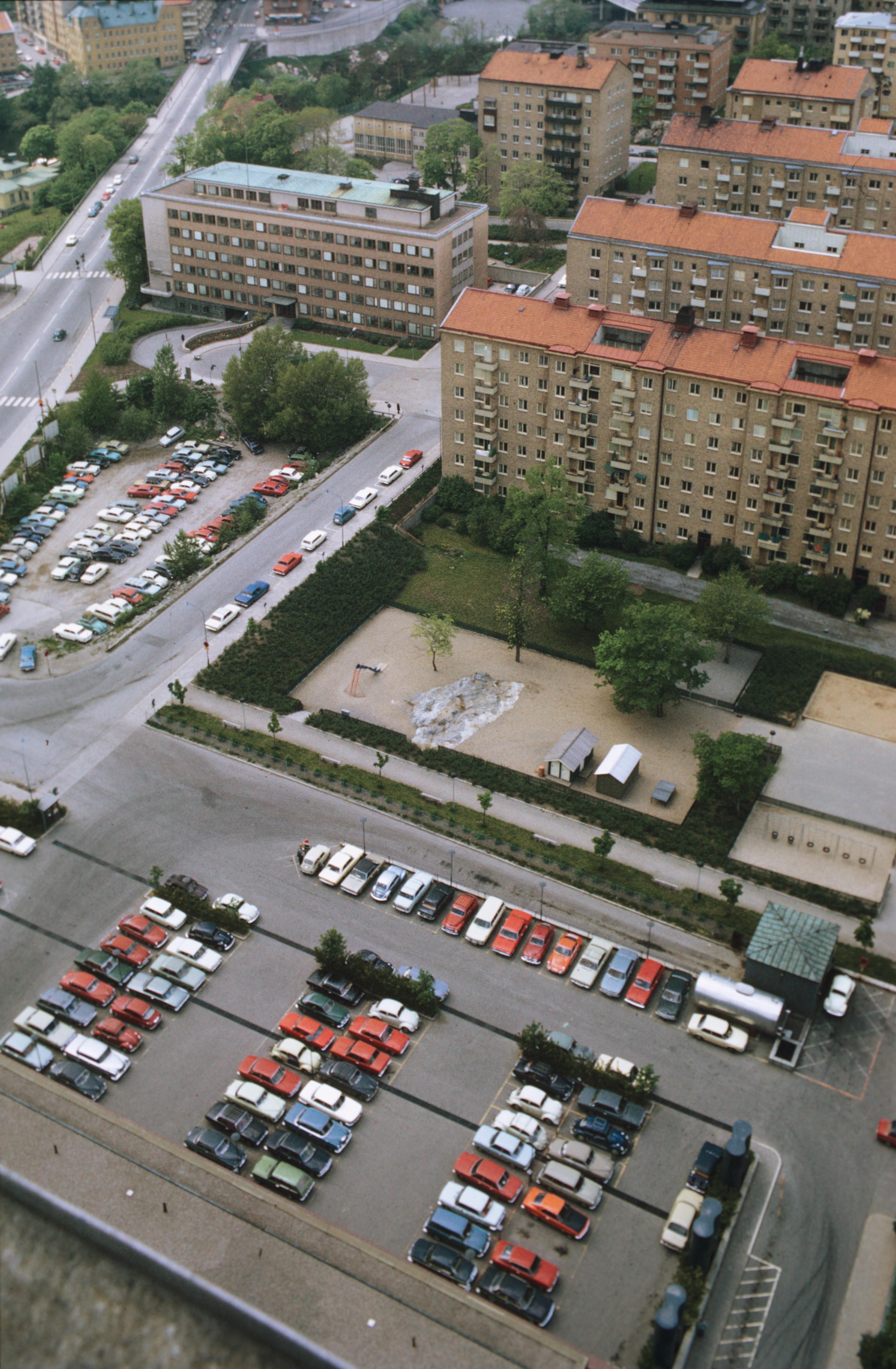 Parkering och bostadshus i Marieberg. Bilden är troligen från början av 70-talet.