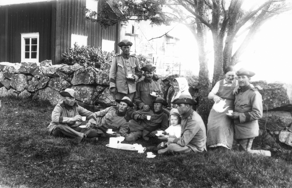 Militärer framför Skinnars "gammelbyggning" ca 1915. I halsduk Margta Hansson, Lenninge 6:14, född 1862 med dottersonen Jonas Persson, född 1913. Till höger Ella Olsson, Lenninge 6:43, född 1872. Övriga personer okända.