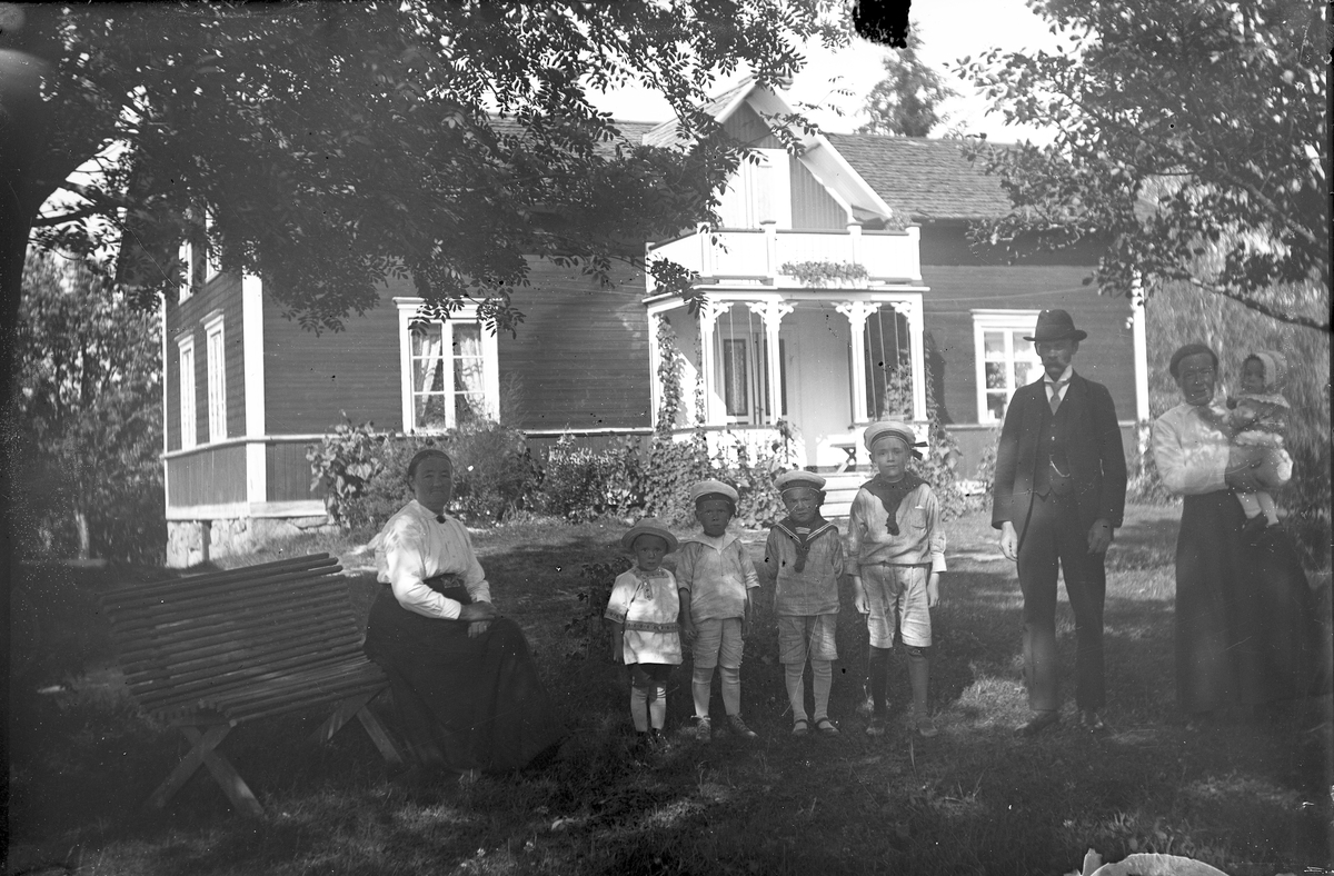 Familjen P J Olsson. Från Höger Vilma med sonen Hugo, P J Olsson, Holger, Hilding Folke, Rune Gunilstam och till vänster mormor Sara