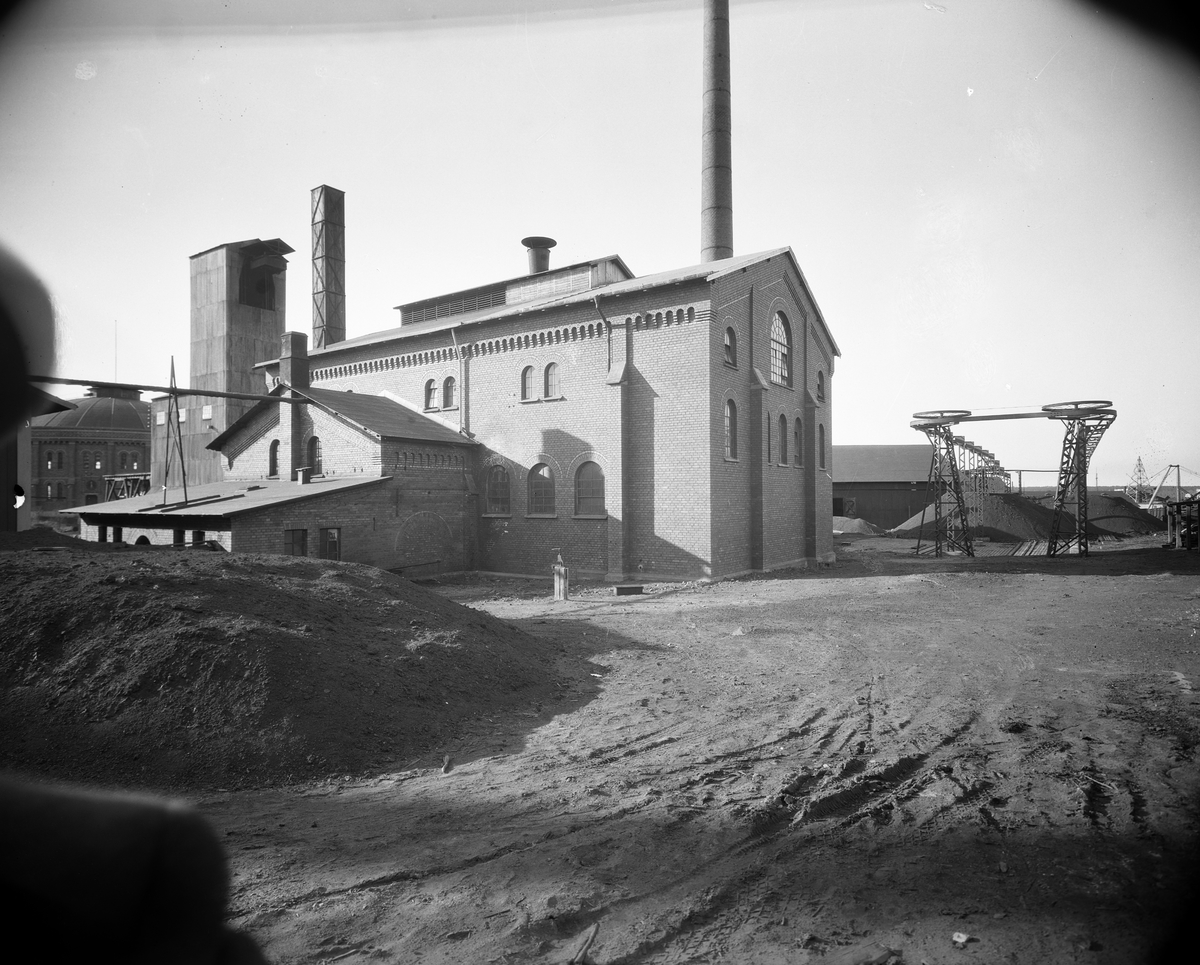 Gefle Stads gasverk, Brynäs. Anläggningen togs i bruk 1893, den större gasklockan uppfördes 1898. Ammoniakverk uppfördes 1903 och ett kokstorn 1926.
