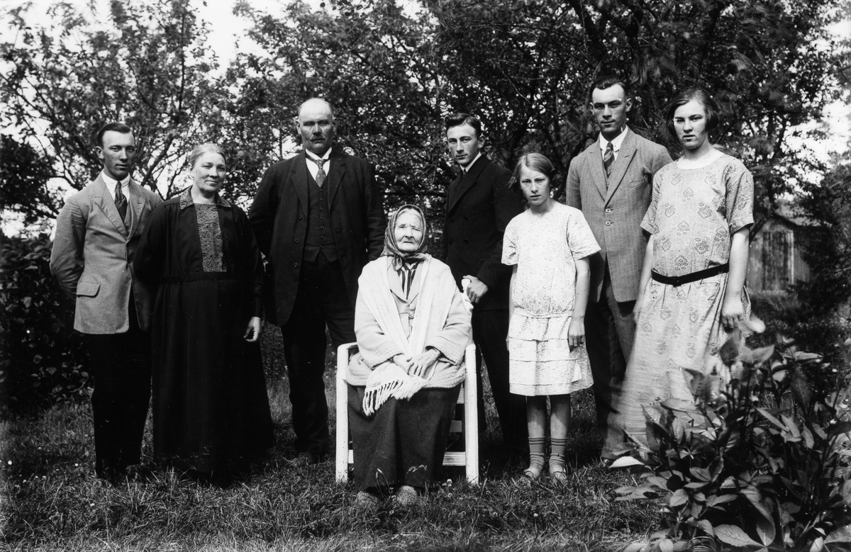Familjefoto från Nils-Nils i Lenninge, troligen 1924. Stående från vänster: Lars, Kristin, Johan, Johan, Elin, Nils och Stina. Sittande: Stina Nilsson, född Holmberg, 1836.
