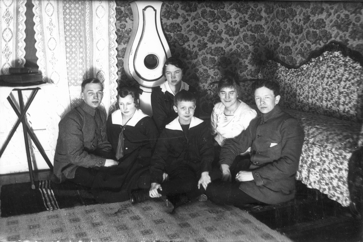 Syskonen Söderberg från "Skräddars", Voxsätter 7:1, samt en flicka, Hagar Jakobsson, från Adelsö. Från vänster: Verner född 1895, Olga född 1903, Frida född 1898, Algot född 1908, Hagar Jakobsson samt Martin född 1891. Bilden tagen 1919-20.