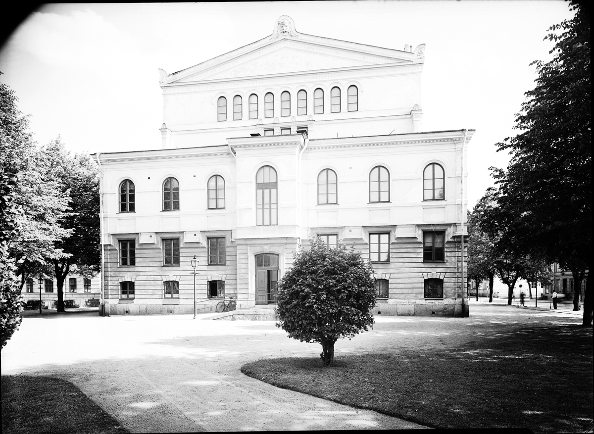 Fotot är taget från Hantverkargatan och visar baksidan av teatern innan tillbyggnaden av Folkteatern 1983.