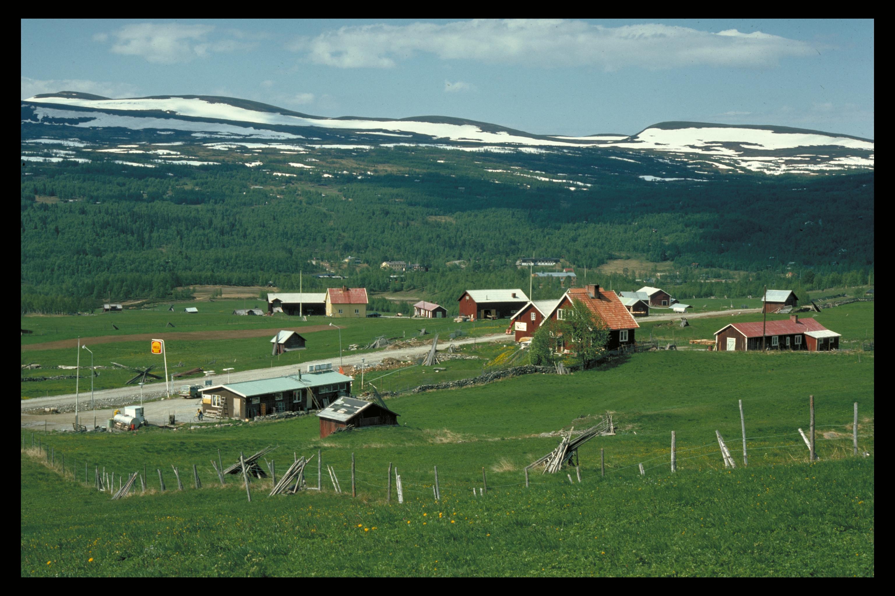 Shellmacken och bebyggelse i förgrunde, fjällen i bakgrunden. Bilden troligen från mitten av 1970-talet.