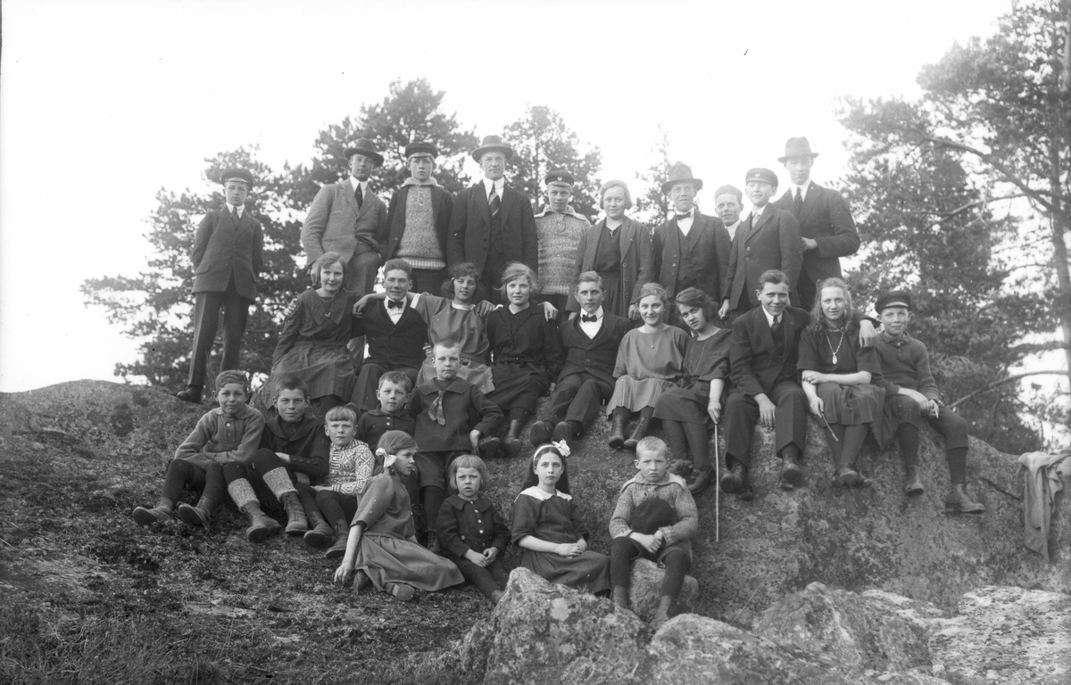 Personerna är från vänster, bakre raden: okänd, Per Wallner, Lenninge 4:51, född 1901, okänd, Petrus Nilsson, Voxsätter nr 1, född 1900, Gösta Persson, Voxsätter 5:3, född 1908, Julia Persson, Voxsätter 1:9, född 1906, två okända, Johan Johansson, Lenninge 1:3, född 1909, Nils Johansson, Lenninge 1:3, född 1894. Mittre raden från vänster: Elin Larsson, Lenninge 5:29, född 1907, Axel Olsson, Lenninge 4:47, född 1907, Agda Granlund, Lenninge 5:31, född 1905, Britta Jansson (dotter till kusken på herrgården), Verner Hall, Lenninge 10:1, född 1904, Astrid Sjörén, Svea Nordenmark, Einar Lönn, född 1905 och son till banvakt S J Lönn, Margit Swanström. Barnen i främre raden är från vänster: okänd, Gösta Olsson, Lenninge 3:13, född 1910, Sixten Larsson, Lenninge 5:29, född 1914, Gösta Johansson, Voxsätter 12:1, född 1914, okänd, Sven Persson, Voxsätter 2:3, född 1913, okänd, Rut Edh, Lenninge 13:1, född 1912 och Bengt Jansson (son till kusken på herrgården).