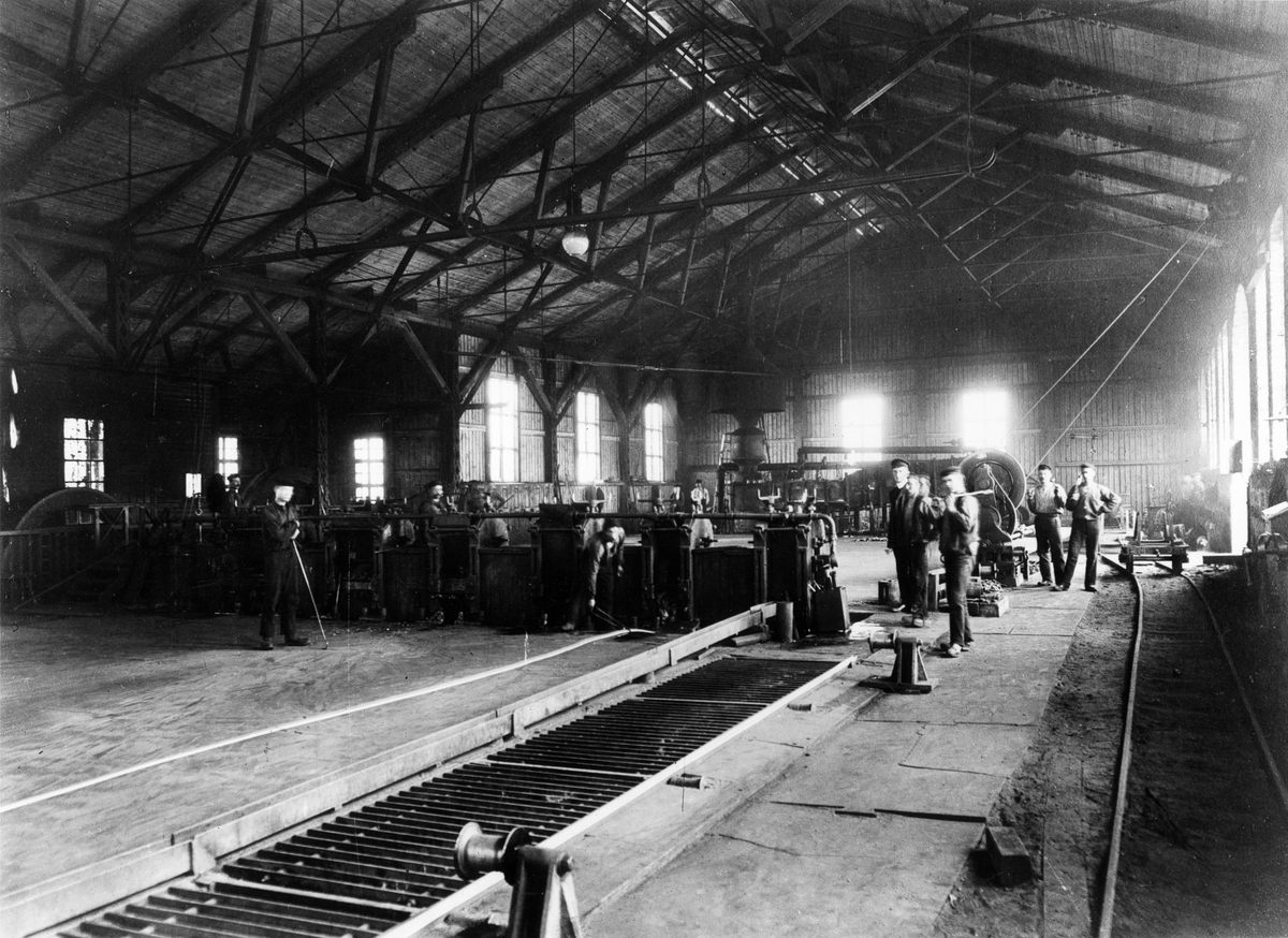 Forsbacka jernverk. Finvalsverket, interiör. Foto i början av 1900-talet, troligen 1907-08.