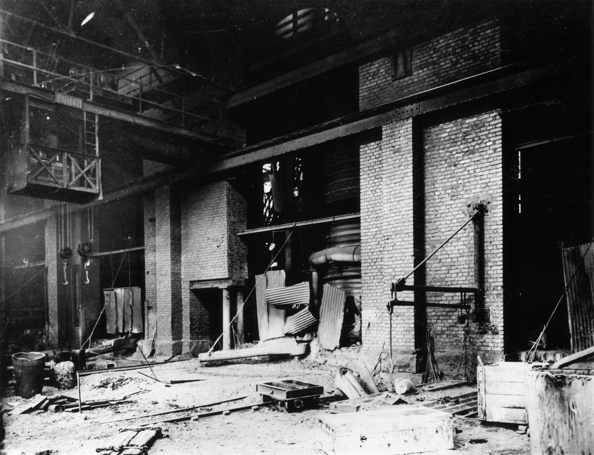 Forsbacka jernverk. Masugnen, utslagsplats för det färdiga tackjärnet. Foto: Carl Larsson, 1920-talets början.