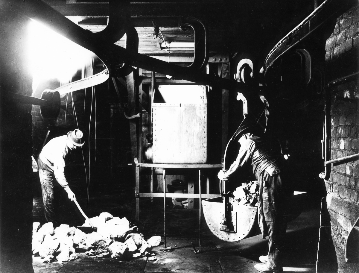 Forsbacka jernverk. Matning av malmkrossen. Foto: Carl Larsson, 1920-talets början.