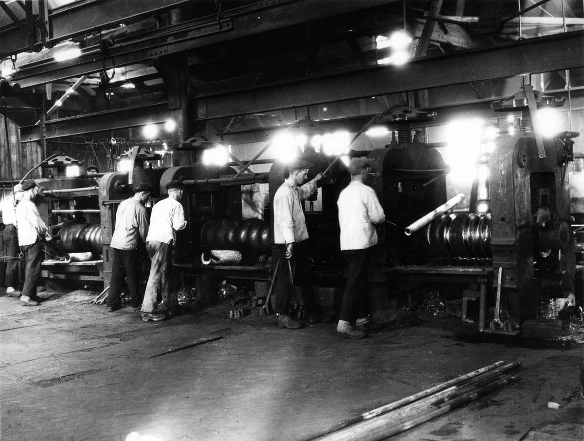 Forsbacka jernverk. Rörvalsverket, rörvalsning i grovparen. Foto: Carl Larsson, 1920-talets början.