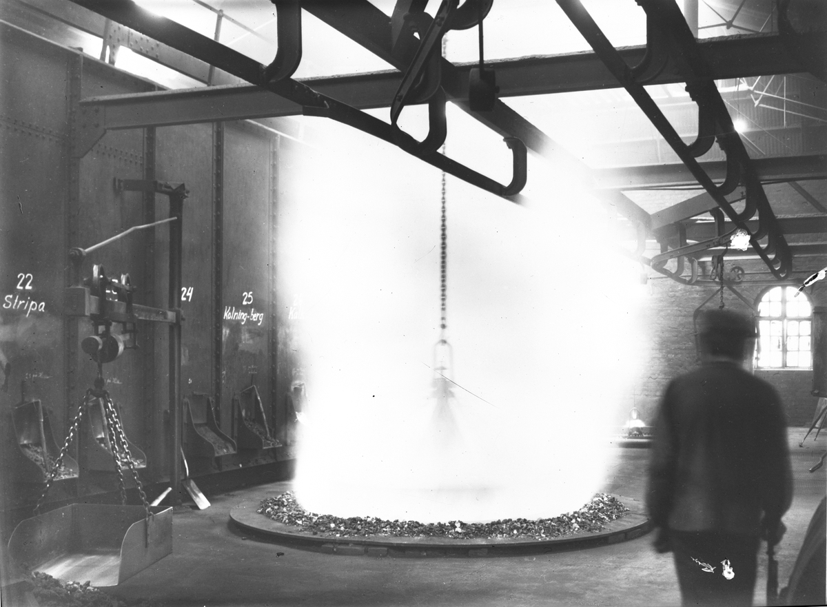 Forsbacka jernverk. Masugnskransen, tömning av uppsättningsmål, "släpp". Foto: Carl Larsson, 1920-talets början.