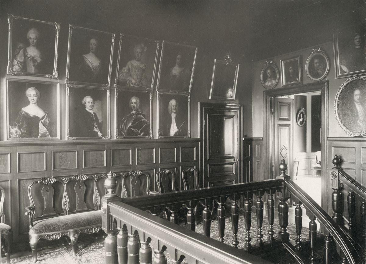 Interiör av Villa Rettig, Gävle. Övre trapphuset med porträtt på väggen.