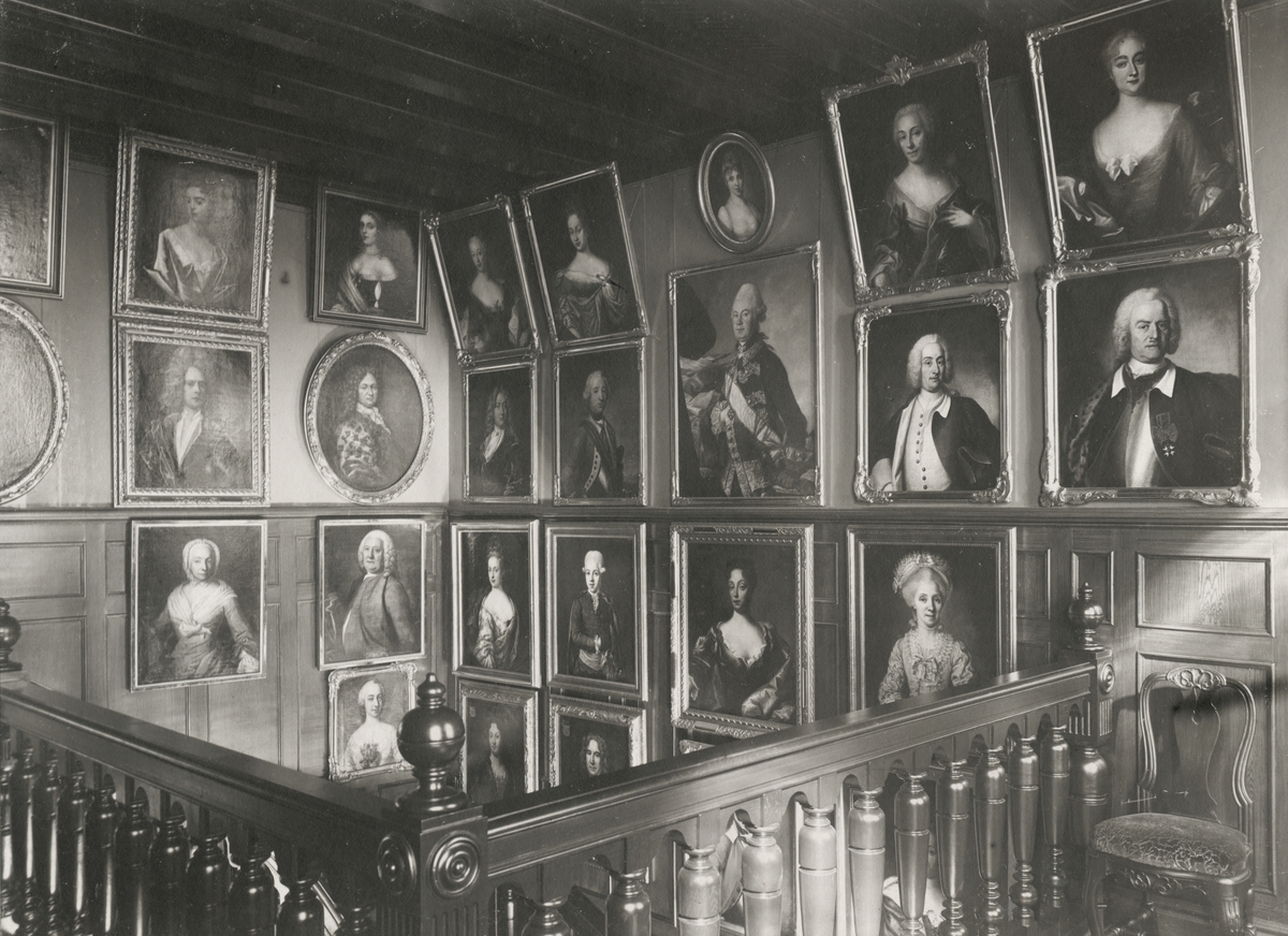 Interiör av Villa Rettig, Gävle. Övre trapphuset med porträtt på väggen.