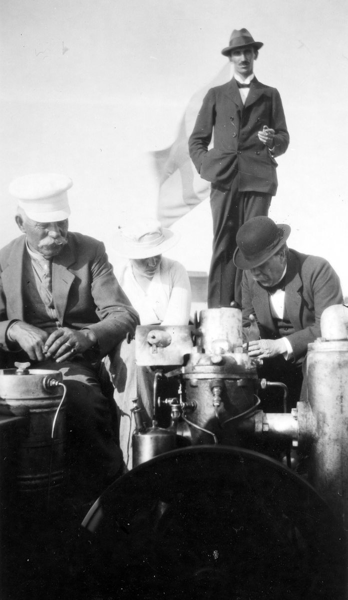 Båtmotor. Sittande till vänster J. Östblom och stående Sahlberg
