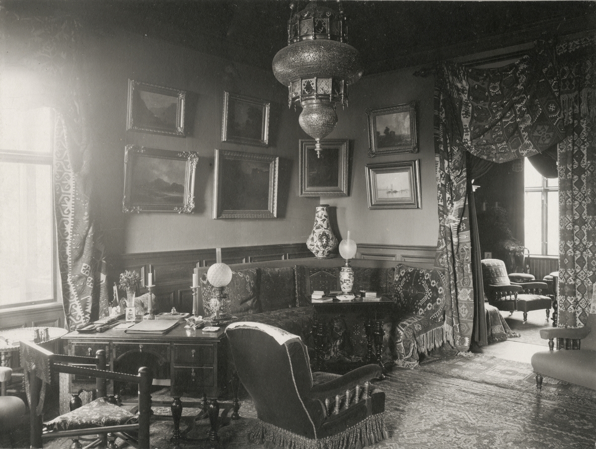 Interiör från Villa Rettig. Litet damskrivbord med munkstol. Ottoman med matchande kraftiga draperier. I taket hänger en orientalisk lampa.