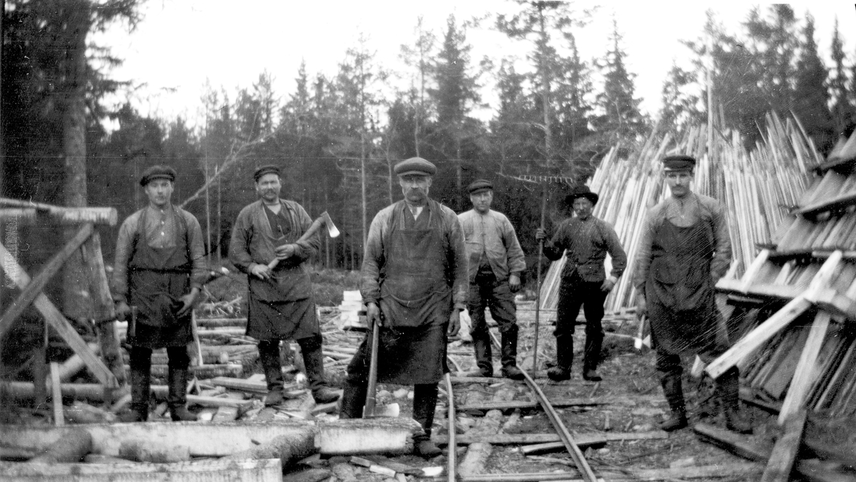 Kolgården vid Axmarby såg. Från vänster 1 - 2. Okända, 3. P. O. Hägg 4. Magnus Nyberg 5 - 6. Okända.