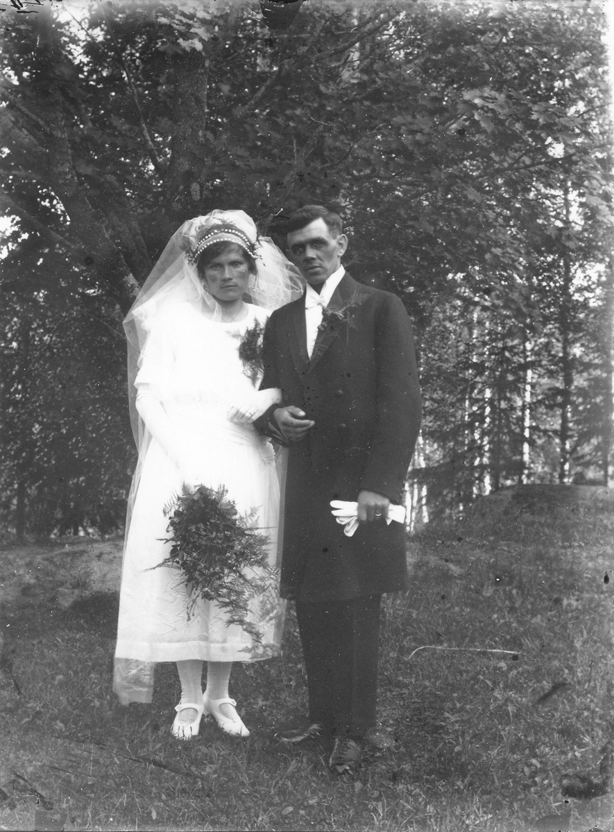 Brudparet Marta Olsson, Västansjö by ("Lasses") och Erik Jonsson ("Bageri"), Håbacken, båda födda omkring 1895. De fick sedermera sonen Evert, född 1924 (?) och dottern Ingrid, född 1932.