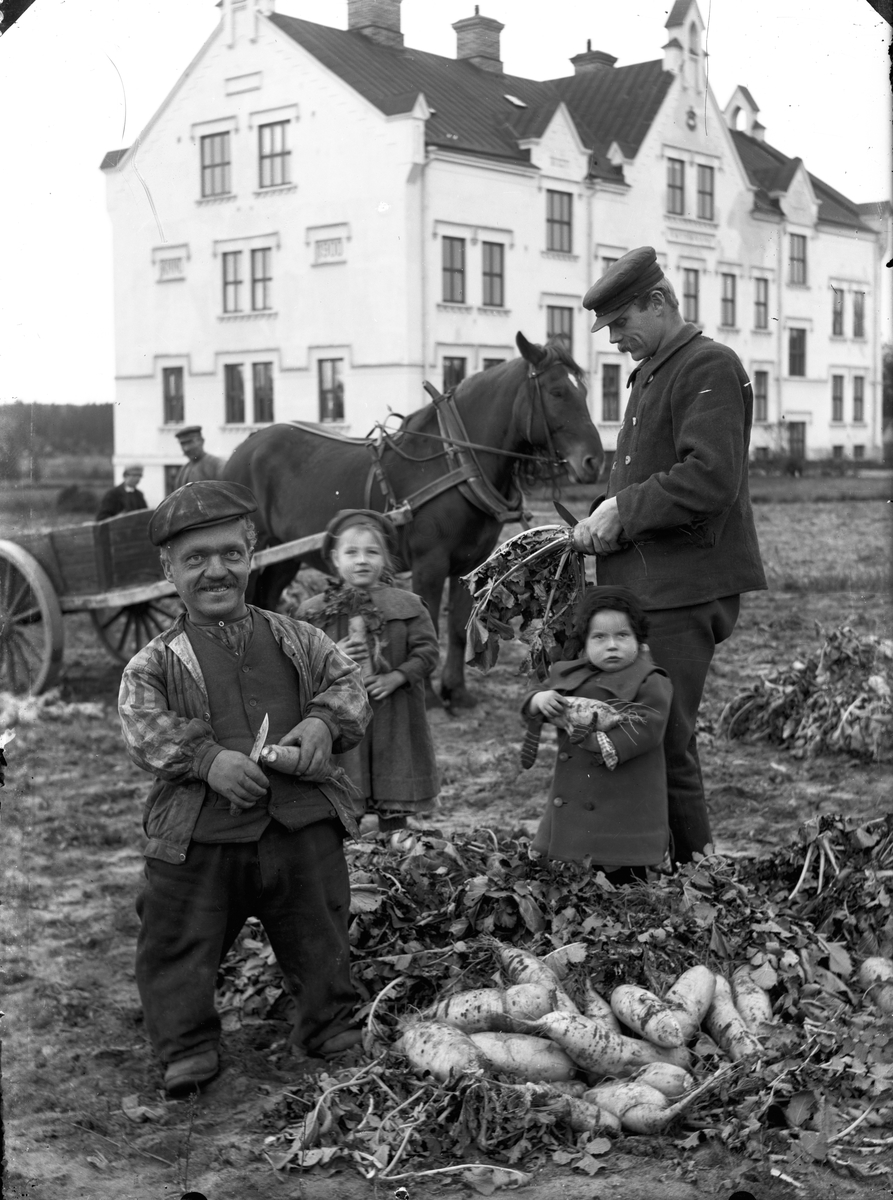 Rovupptagning på gamla kommunhemmet ("fattigvården"), "Lill-Johan" i förgrunden. Mannen till höger är Ernst Wilgot Rooth och den minsta flickan Anna-Lisa Rooth.