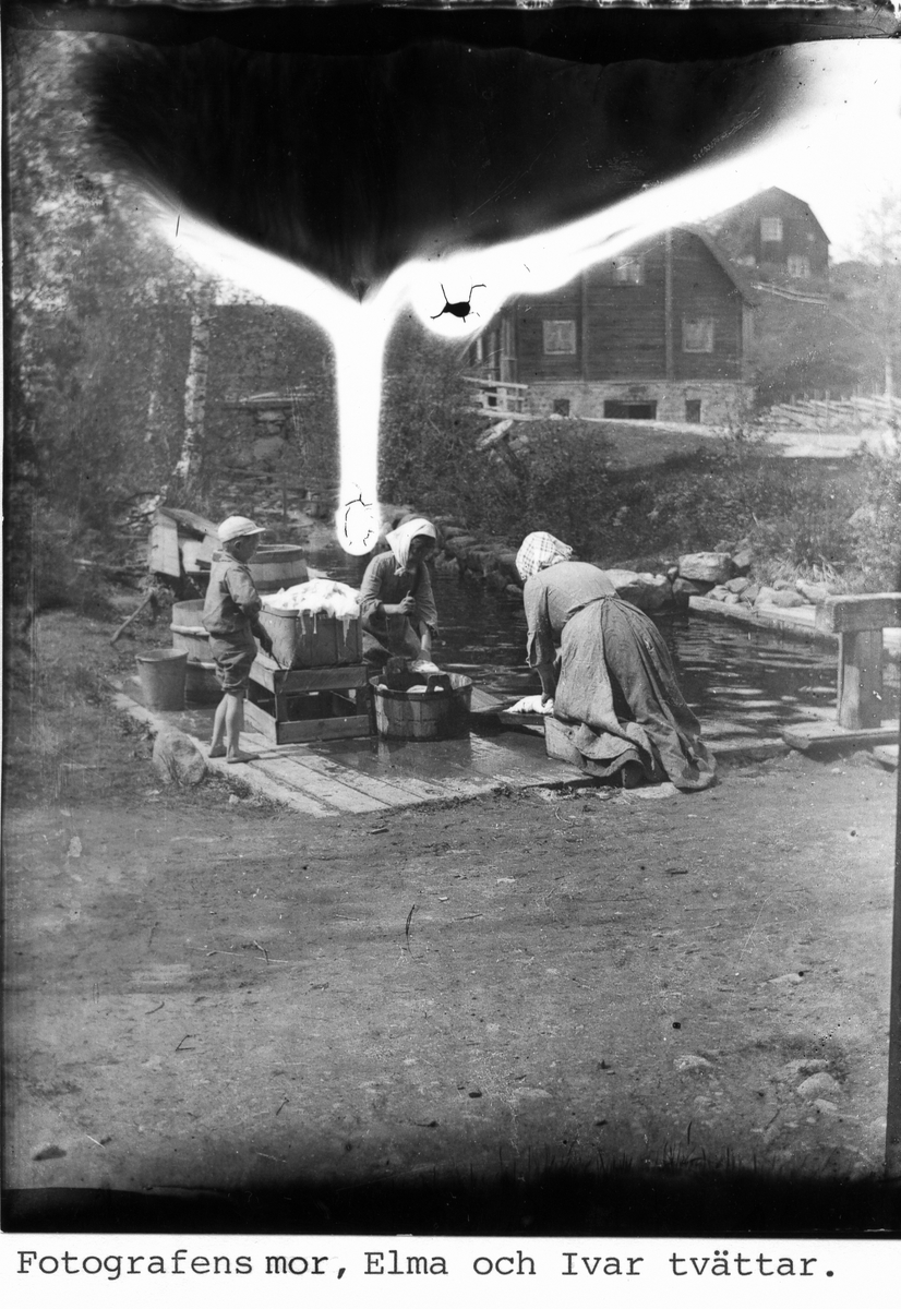 Byk vid Tullkvarn. Fotografens mor Anna Greta, Elma (Elis syster) och Ivar (Elis bror) tvättar.