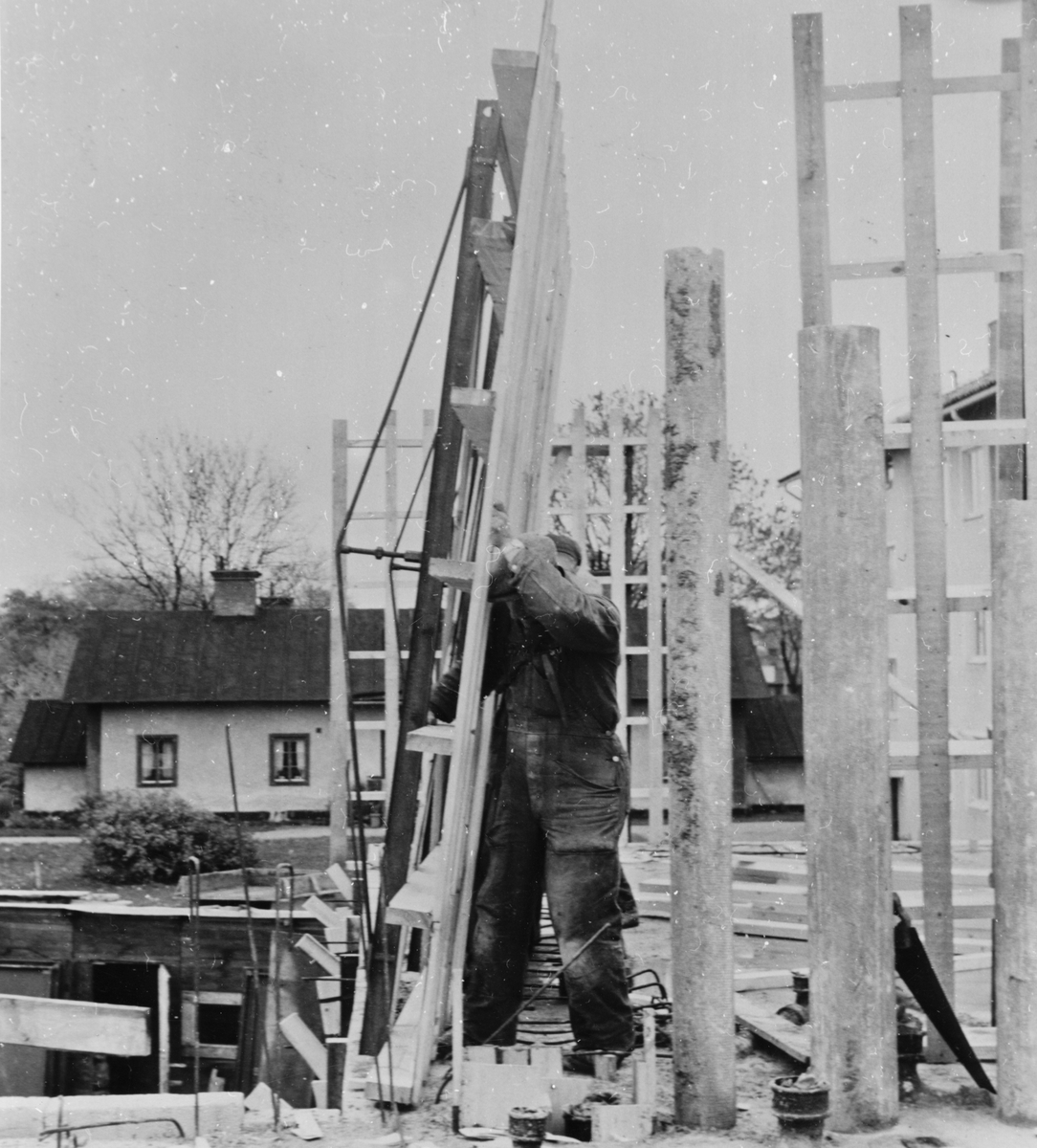Gjutningsarbeten vid Diös-bygget i kvarteret Blocket i Sandviken, oktober 1953. Vid gjutningsarbetet användes bl.a. "Specialformluckan" tillverkad av plywood från fabriken i Ljusne.
