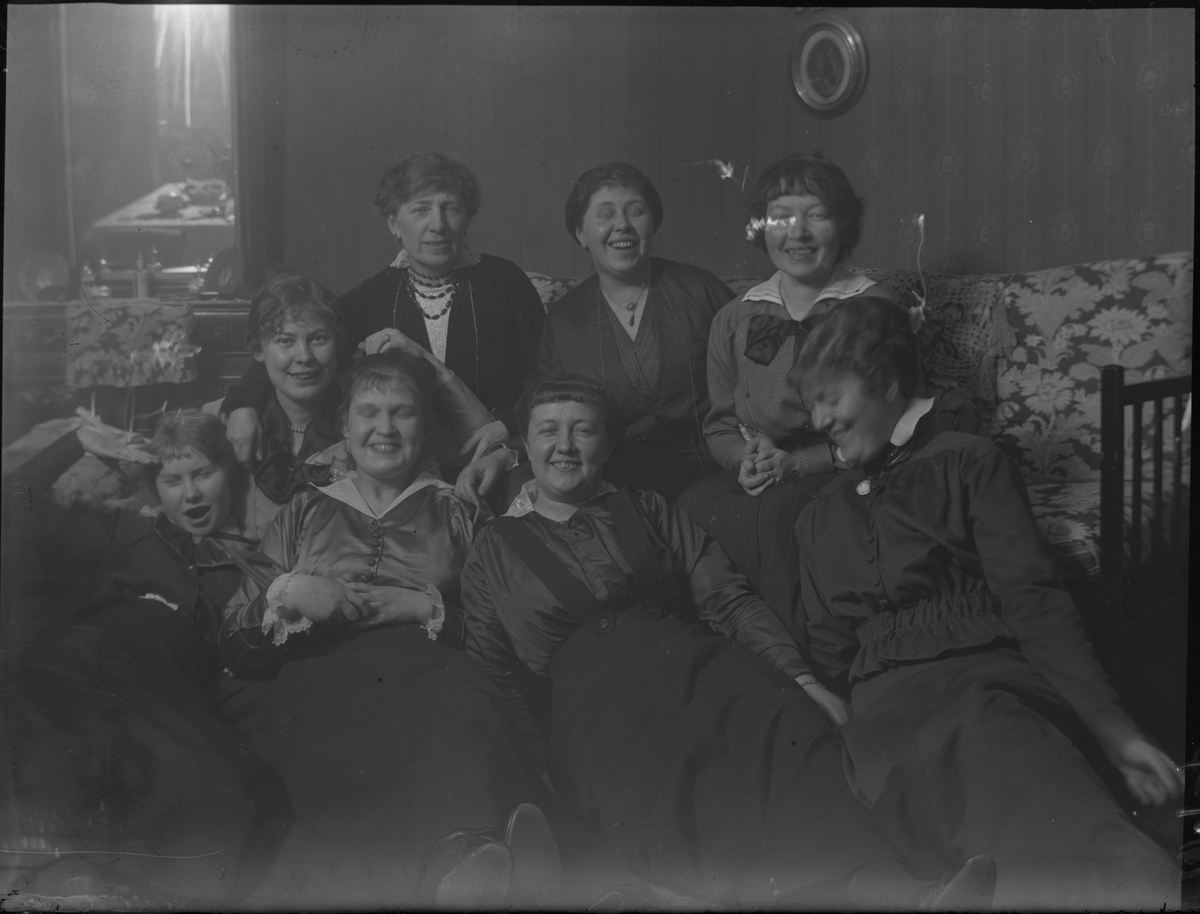 Hanna Olsson, Elna Brundins syster, bodde i Stockholm och hade sitt umgänge där. Här är ett glatt gäng, där Hanna sitter längst till höger.