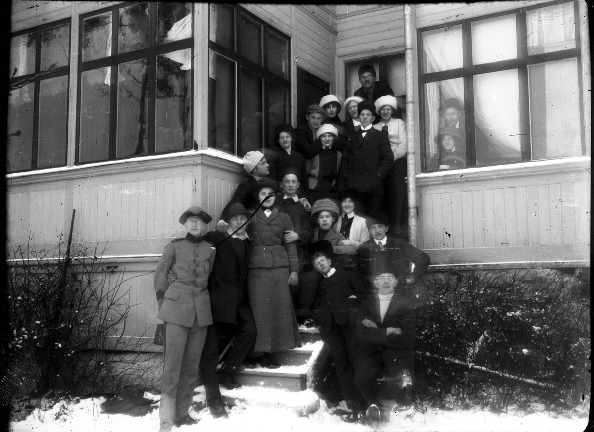 Beväringen till vänster är troligen Einar Olsson (bror till Elna Brundin) och hans syskon står i trappan. Längst upp står David Brundin och Elna i vit mössa och vit blus. Övriga okända.