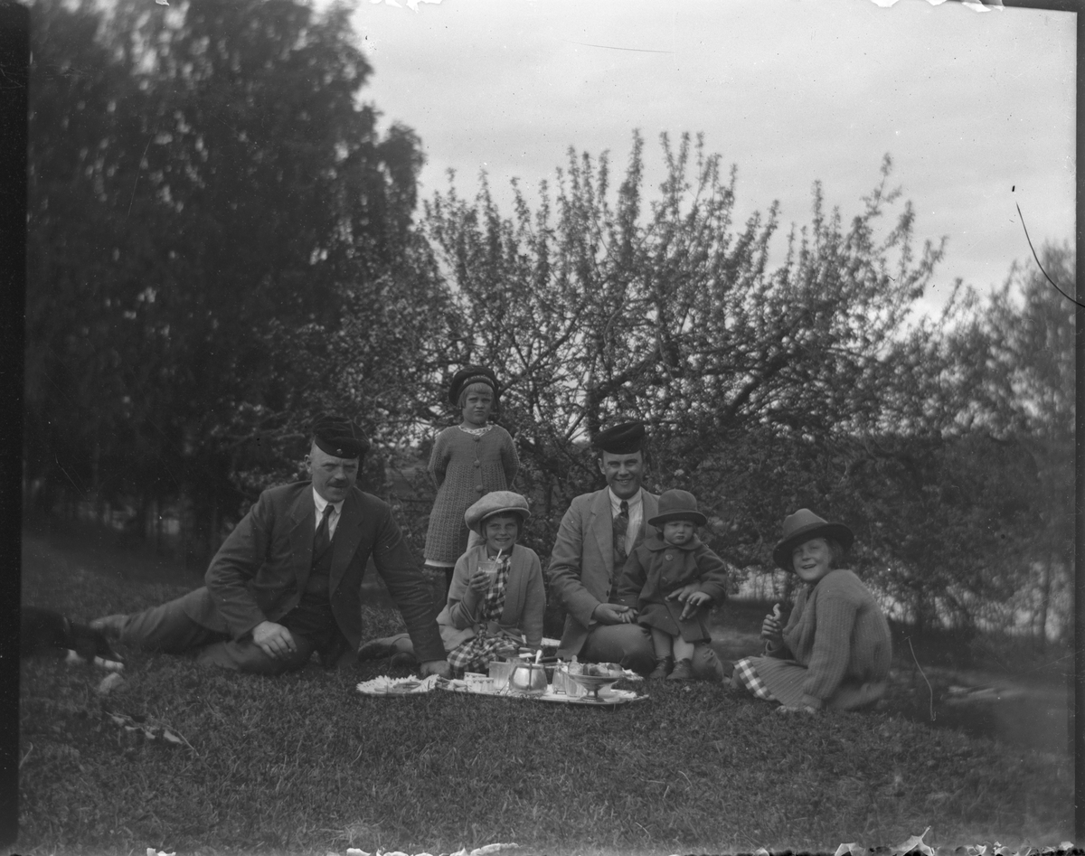 David Brundin med sina barn och en farbror som kallades "Moffa". Året kan vara 1923. Dom spexade och bytte mössor.