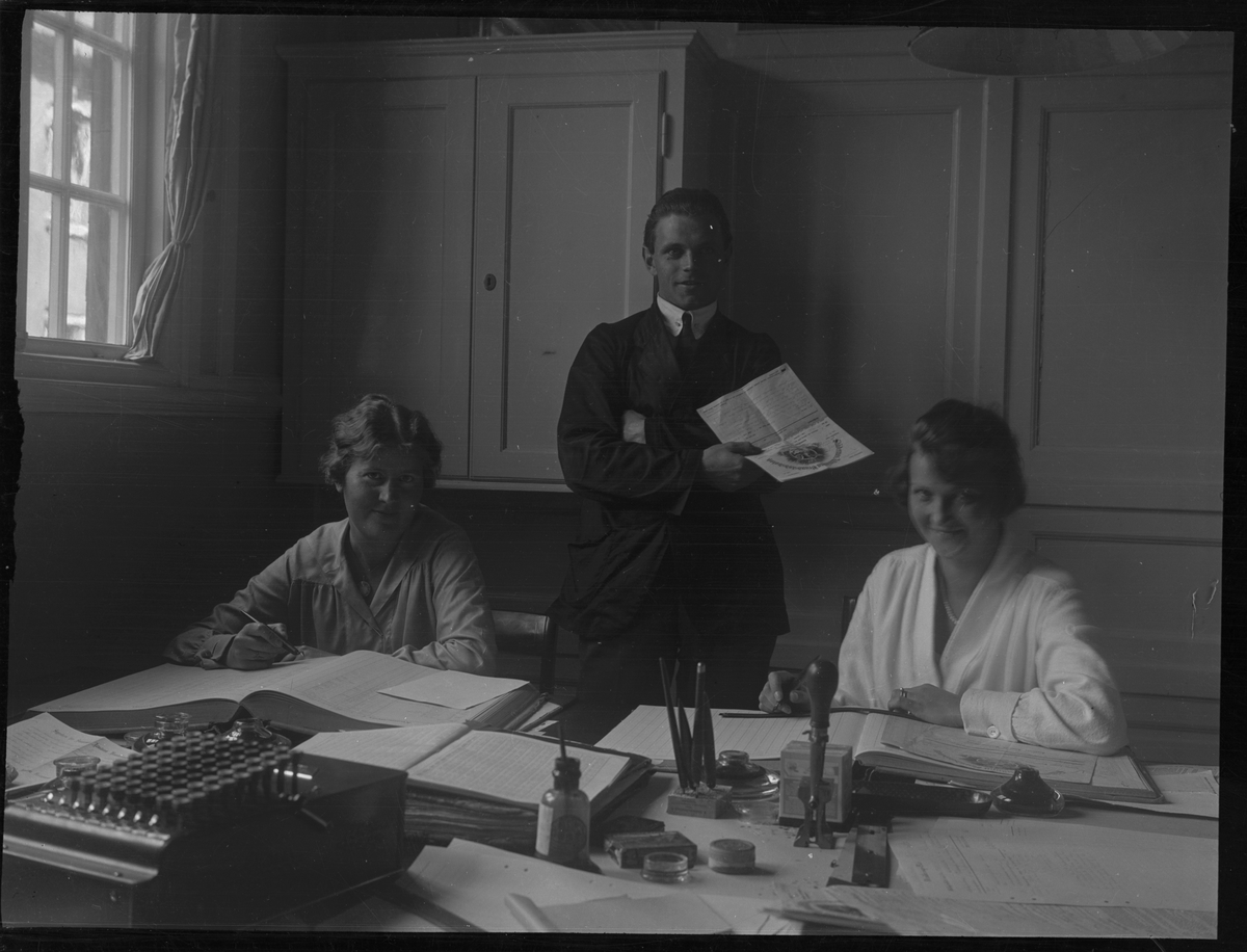 Titel: Hanna Olsson, Elna Brundins syster, kom till Stockholm och fick tjänst som kontorist på Städernas allmänna brandstodsbolag. Det här torde vara från kontoret. Hanna till vänster.