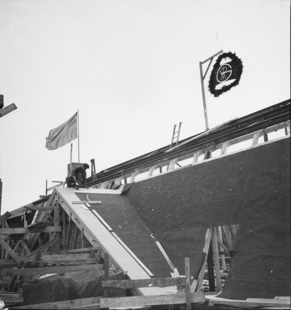 Taklagsfest vid Gävle Museum (nuv Länsmuseet Gävleborg) under byggnadsskedet 1938-40.