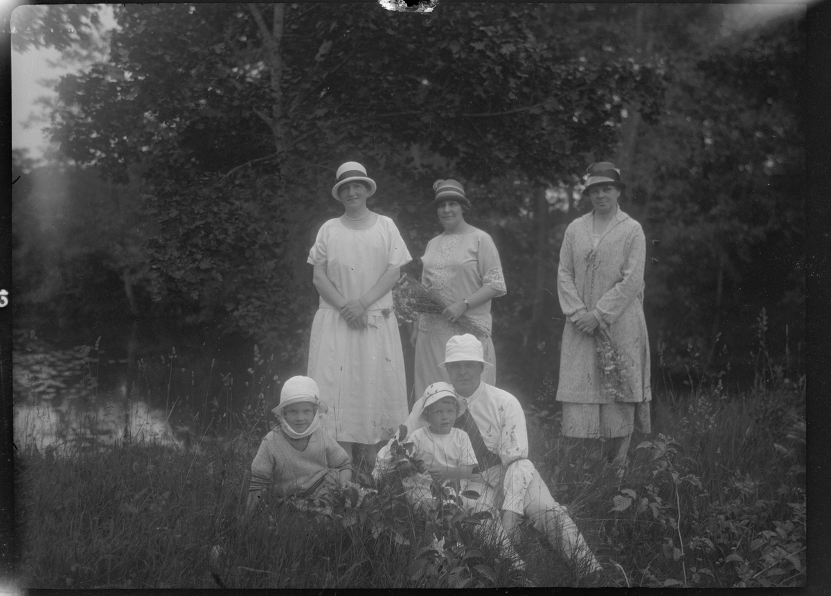 Mannen i mitten är Carl Nordgren, som troligtvis sitter med Eva Brundin i famnen. Flickan till vänster är Märta Nordgren, hennes mamma Gertrud Nordgren (syster till Elna) står bakom. Kvinnan i mitten okänd, men till höger står Elnas halvsyster Lisa som var verksam i Stockholm och förblev ogift.
