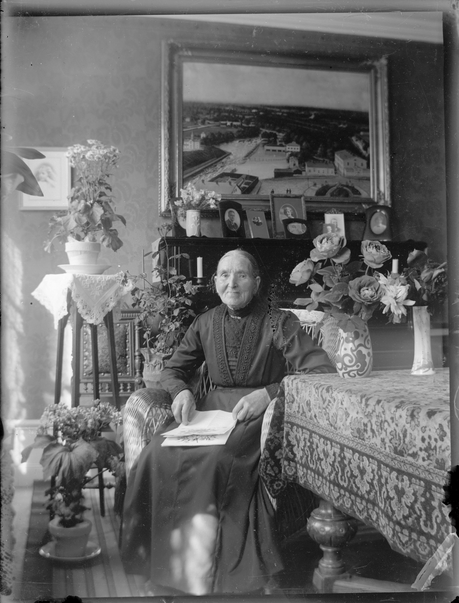 Anna Larsdotter Olssons ärvda trotjänarinna Lena Hemström. Hon bodde i ett vindsrum på 3:e Tvärgatan 15, och här firar hon någon bemärkelsedag. Hon sitter i salen nere i lägenheten. Observera tavlan på väggen. Den föreställer Stadsträdgården med kallbadhuset och Valskvarn och en okänd stiftelse, möjligen engelska stiftelsen.